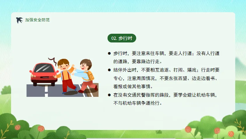 步行:走人行道,不追逐打闹,专心行走。