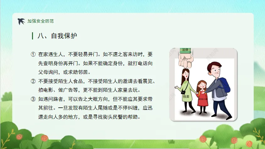 不单独 / 结伴私自外出,不和陌生人打交道,不贪小便宜。