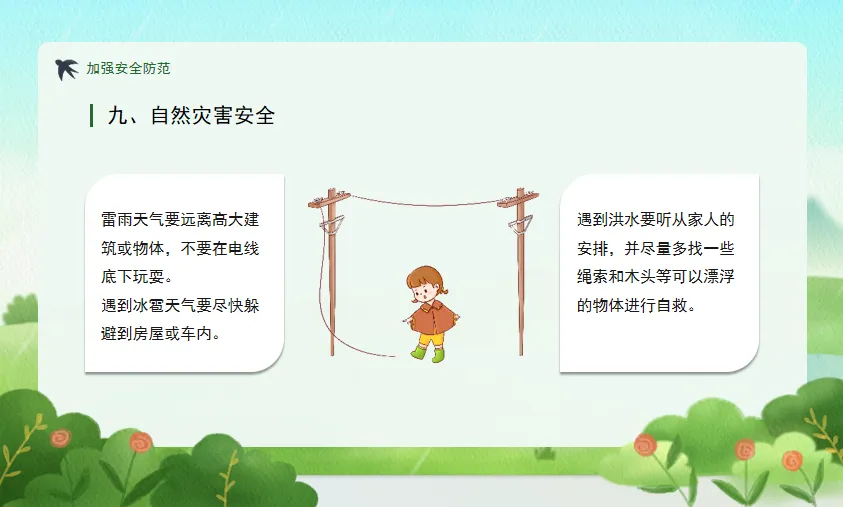 自然灾害:雷雨远离高大建筑,冰雹及时躲避,洪水听从安排自救。