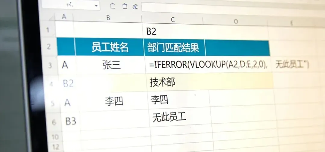 举个小例子:根据 A2 员工姓名,在 D:E 列匹配对应部门,匹配不到显示 “无此员工”,输入公式 =IFERROR(VLOOKUP(A2,D:E,2,0),"无此员工"),一键生成整洁的匹配结果,汇报、统计都超省心!