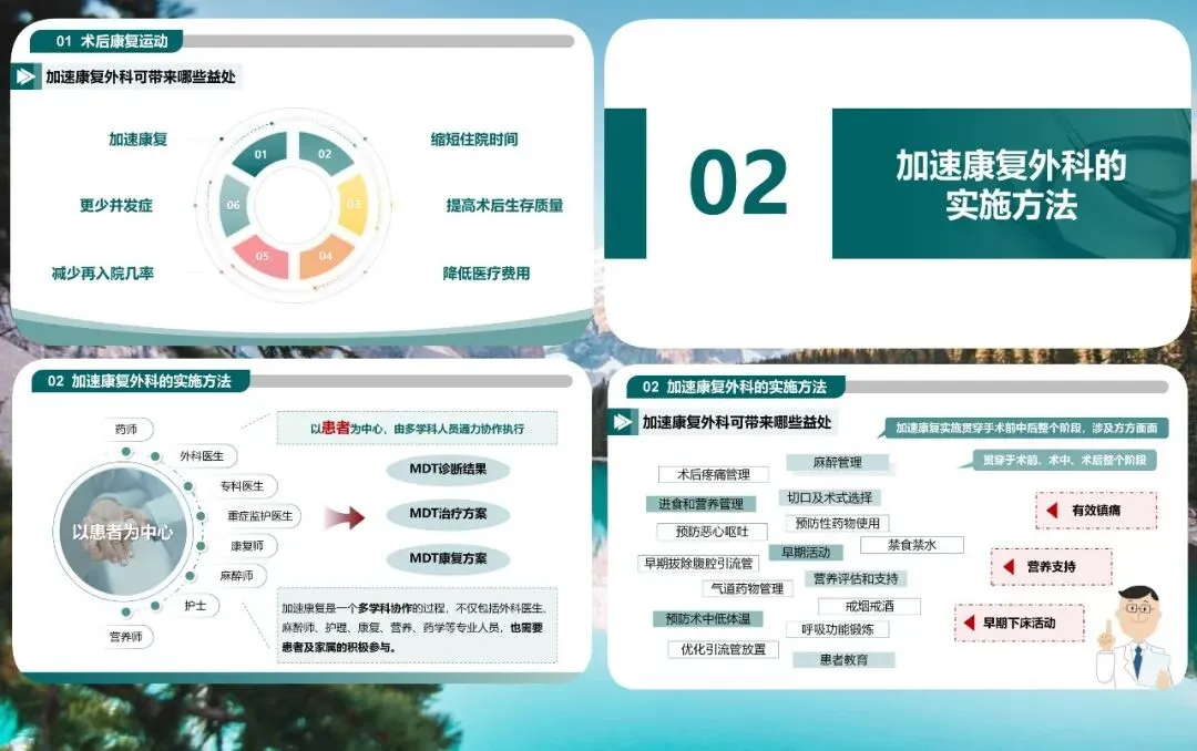 ERAS 的实施贯穿术前、术中、术后全程,需要外科医生、麻醉师、护士、康复师、营养师等团队紧密配合,同时离不开患者及家属的主动参与。核心目标是减少应激、有效镇痛、早期营养支持、早期下床活动,这四点也是加速康复的关键支柱。