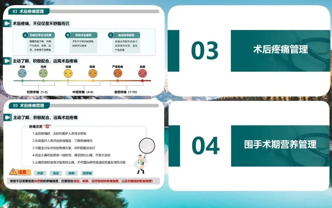 围手术期疼痛管理是重中之重。术后疼痛不仅影响舒适度,还会延缓活动、降低睡眠质量、增加并发症风险。我们要引导患者正确评估疼痛,及时反馈休息、活动、咳嗽、深呼吸时的疼痛程度,按时规范使用镇痛药物,拒绝忍痛硬扛。