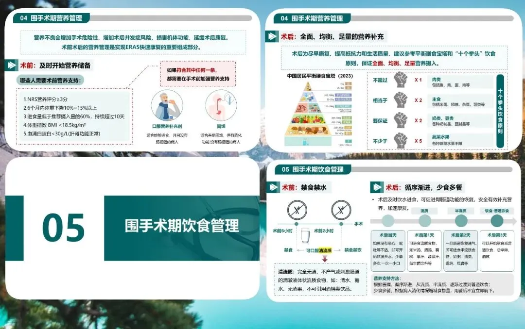 营养管理是快速康复的核心环节。术前对营养不良高危患者及时启动营养支持,术后遵循循序渐进的饮食原则,从清流质、流质、半流质逐步过渡到普通饮食,遵循十个拳头原则保证均衡摄入,为组织修复提供充足能量。