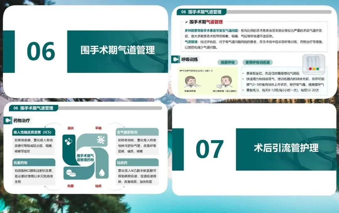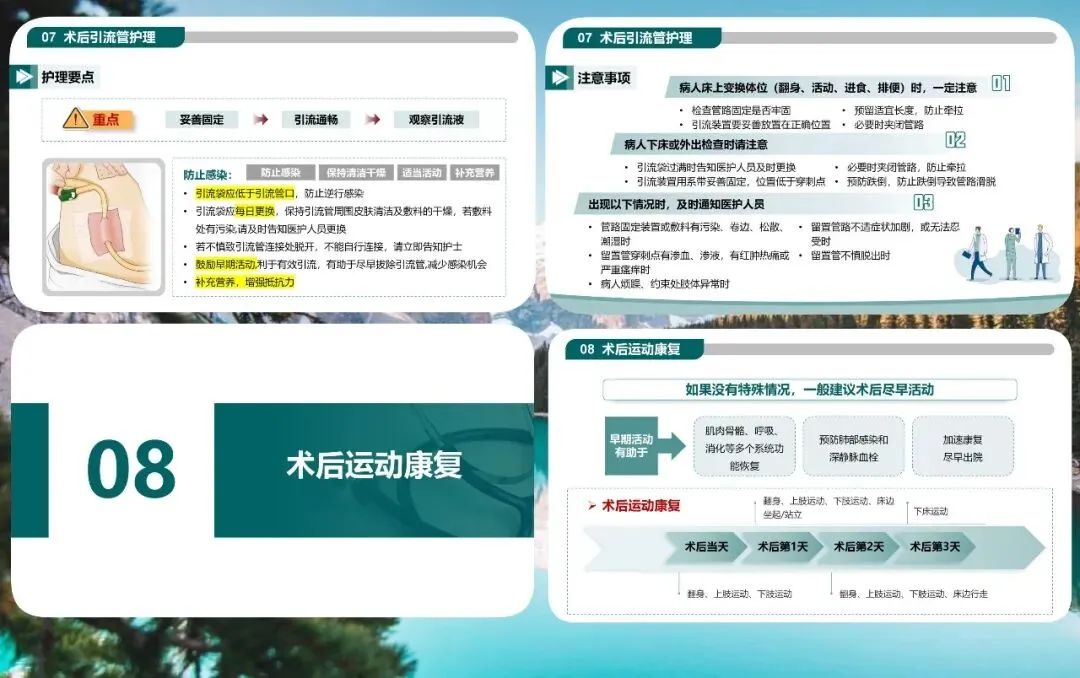 气道管理、引流管护理、早期康复运动同样关键。术前进行呼吸功能训练,术后妥善固定引流管、保持通畅、预防感染。无禁忌证时,术后当天即可开展床上活动,逐步过渡到床边坐起、站立、行走,促进全身功能恢复。