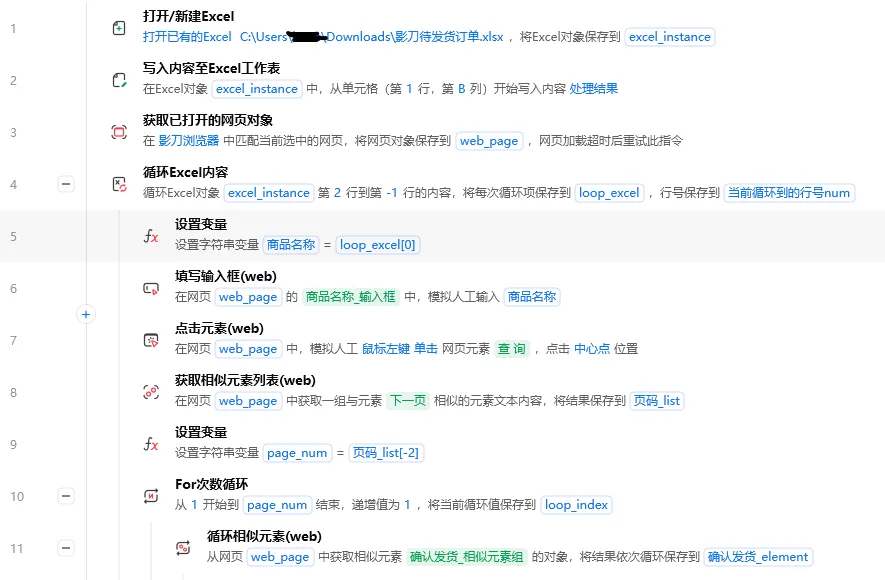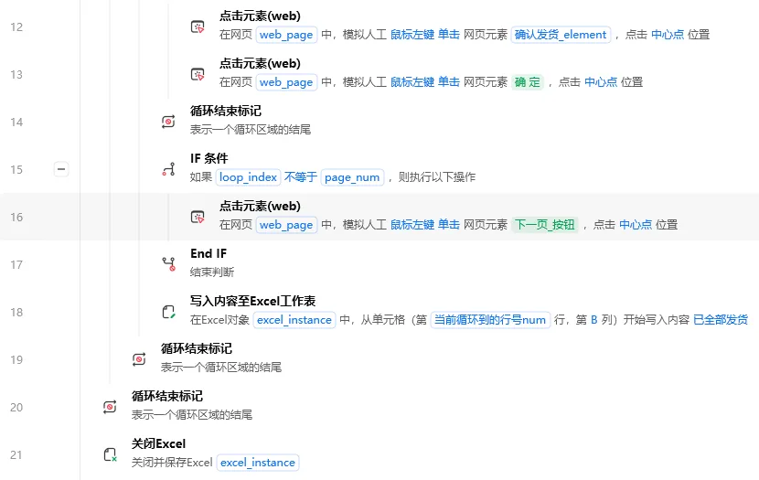 步骤1-3 打开Excel、写入表头、获取网页对象步骤4 【循环Excel内容】从第2行循环到末尾 步骤5 提取商品名称变量 步骤6-7 填写搜索框 → 点击查询 步骤8-9 获取订单总页数 步骤10 【For次数循环】按页处理 步骤11-13 循环点击确认发货 + 确认弹窗 步骤15-17 IF判断:非最后一页则翻页 步骤18 写回Excel:当前行B列 ← "已全部发货"步骤21 关闭Excel(保存)
