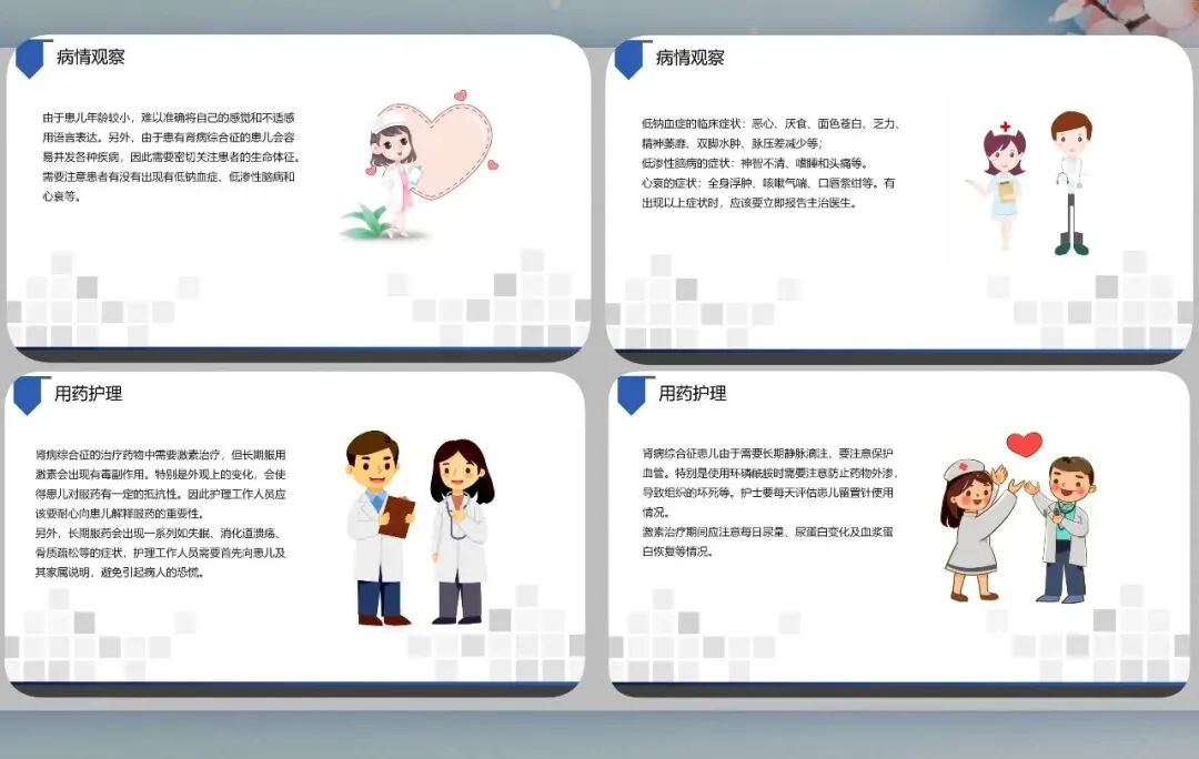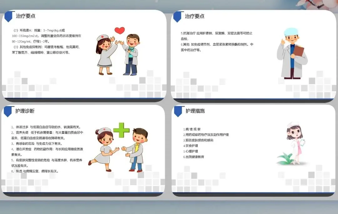 护理工作围绕六大核心诊断展开。病情观察需重点监测生命体征,警惕低钠血症、心衰、低渗性脑病等并发症,及时识别恶心、嗜睡、呼吸困难等异常表现。用药护理要关注激素与免疫抑制剂的副作用,提前告知家属外观改变、消化道不适等均为暂时性反应,提升患儿配合度。