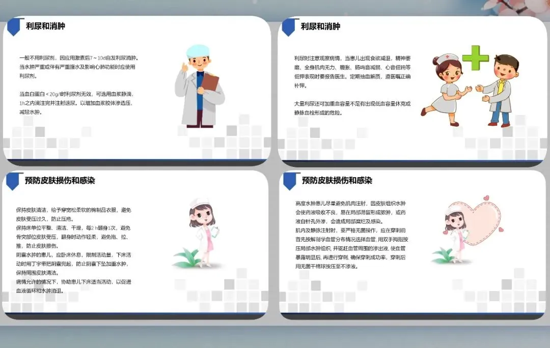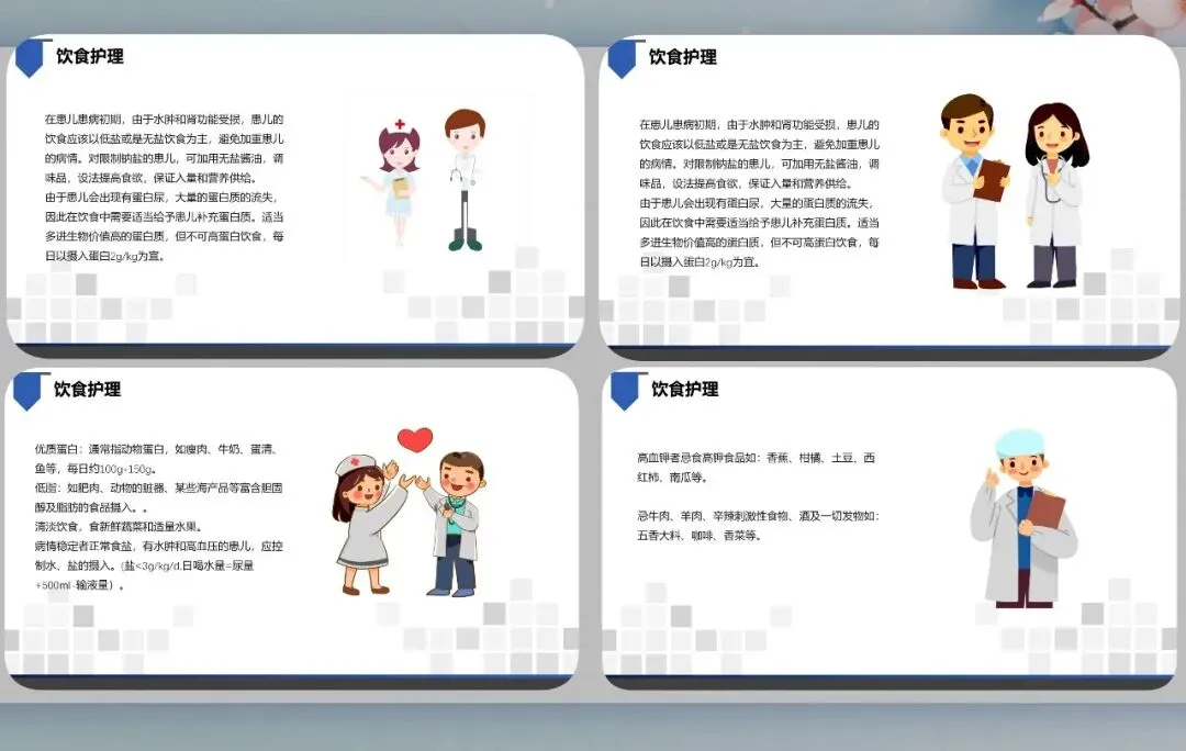 水肿期需做好皮肤护理,保持床单位清洁干燥,定时翻身,阴囊水肿患儿做好托举保护,避免肌肉注射减少感染风险。饮食上遵循低盐、优质蛋白原则,控制每日蛋白摄入量,水肿严重时无盐饮食,缓解后逐步恢复。