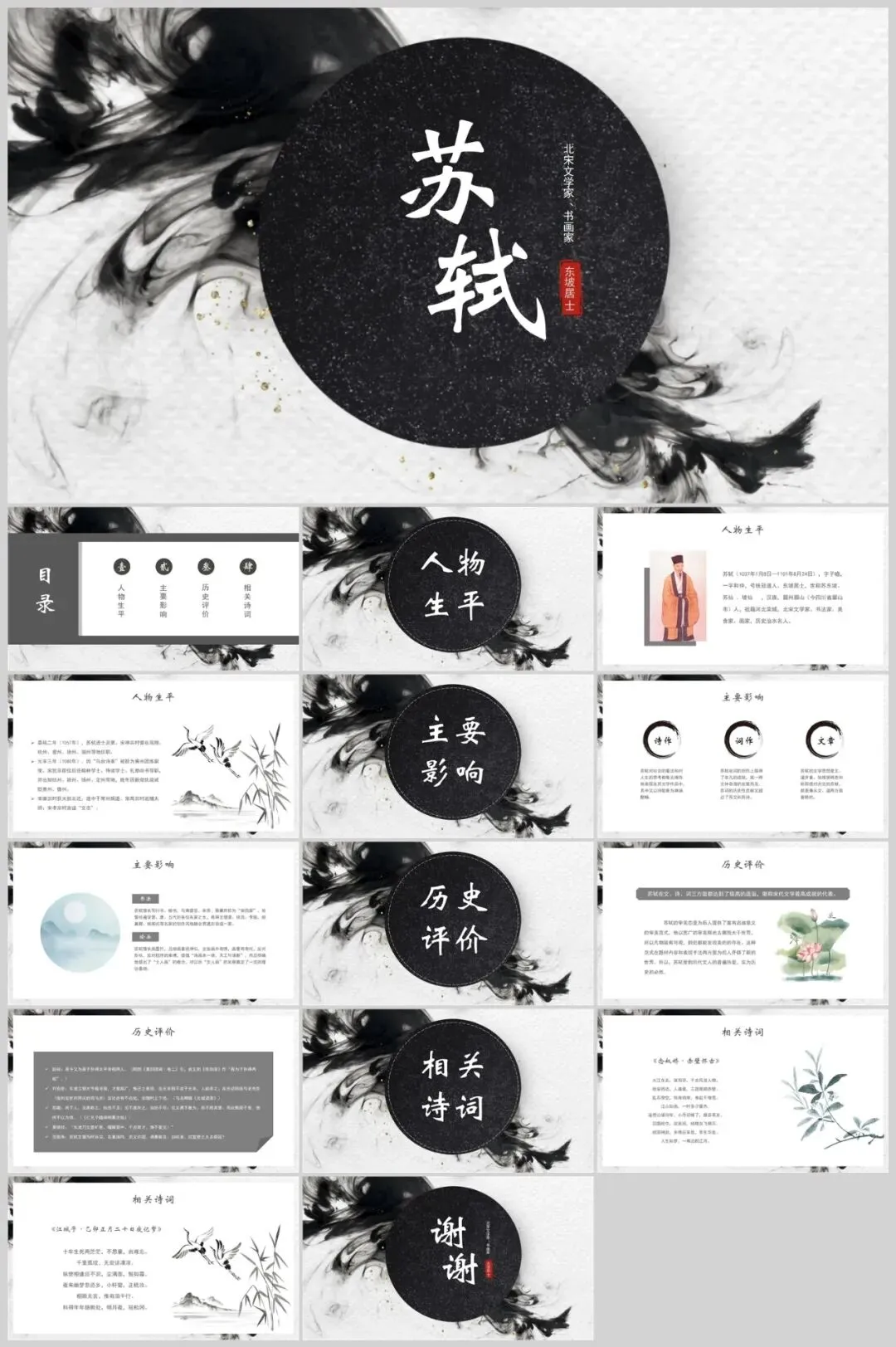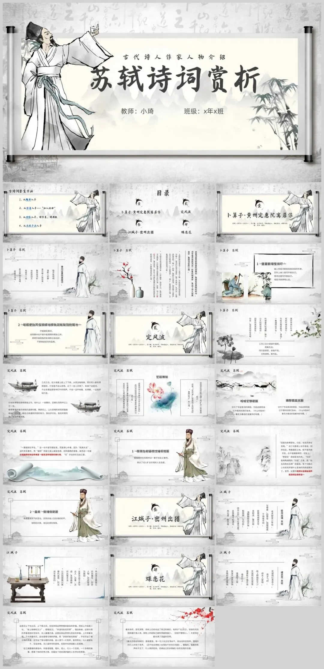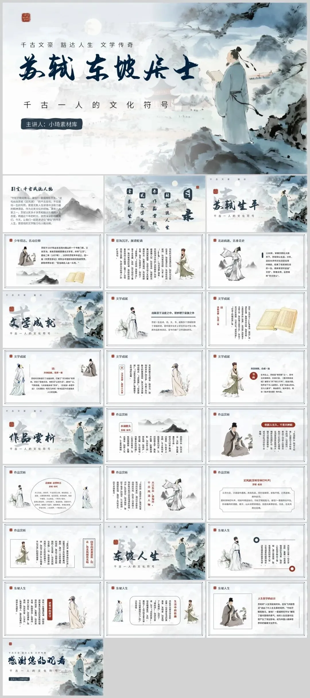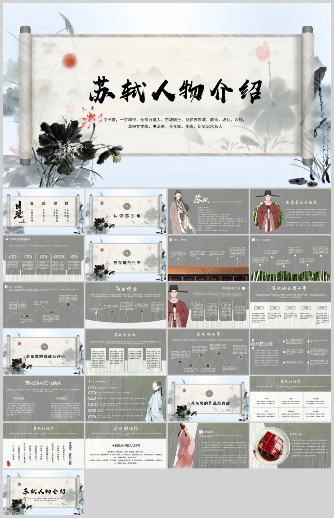 一期全新的苏轼介绍及诗词赏析PPT模板正式上线!这期模板以其简洁明了的设计、深入浅出的内容,以及丰富的案例和数据,必将为您带来一场视觉与思想的盛宴。