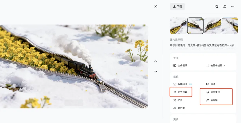 但 AI 的「局部重绘」「消除笔」真的是宝藏功能,我一步步把画面修正: