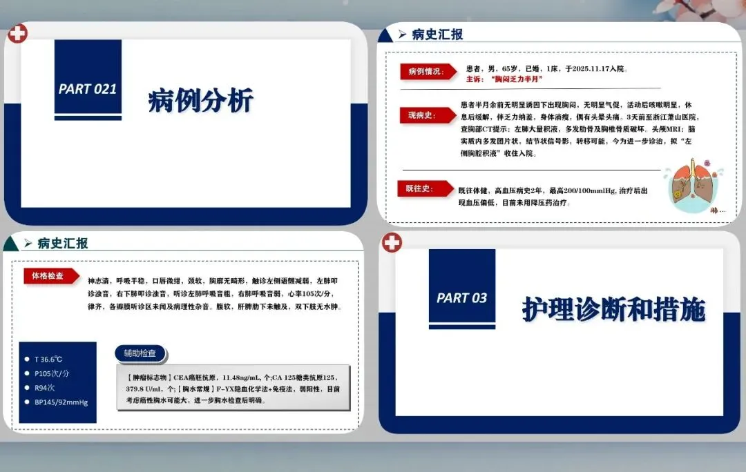 本次查房病例为老年男性,因胸闷乏力入院,检查提示左侧大量胸腔积液,合并肿瘤标志物升高,考虑癌性胸水可能。护理核心围绕气体交换受损、疼痛、感染风险、营养失调等问题开展。