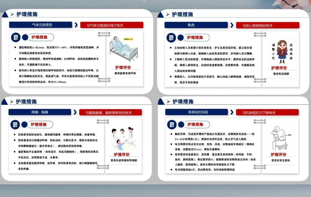 保持呼吸道通畅是首要任务,给予合理氧疗,指导腹式呼吸与有效咳嗽,协助排痰。胸痛护理采取舒适体位,局部热敷,遵医嘱使用镇痛药物,减轻呼吸与咳嗽带来的疼痛。胸腔引流管护理严格执行无菌操作,保持管道密闭,观察引流液颜色、量与水柱波动,预防逆行感染。