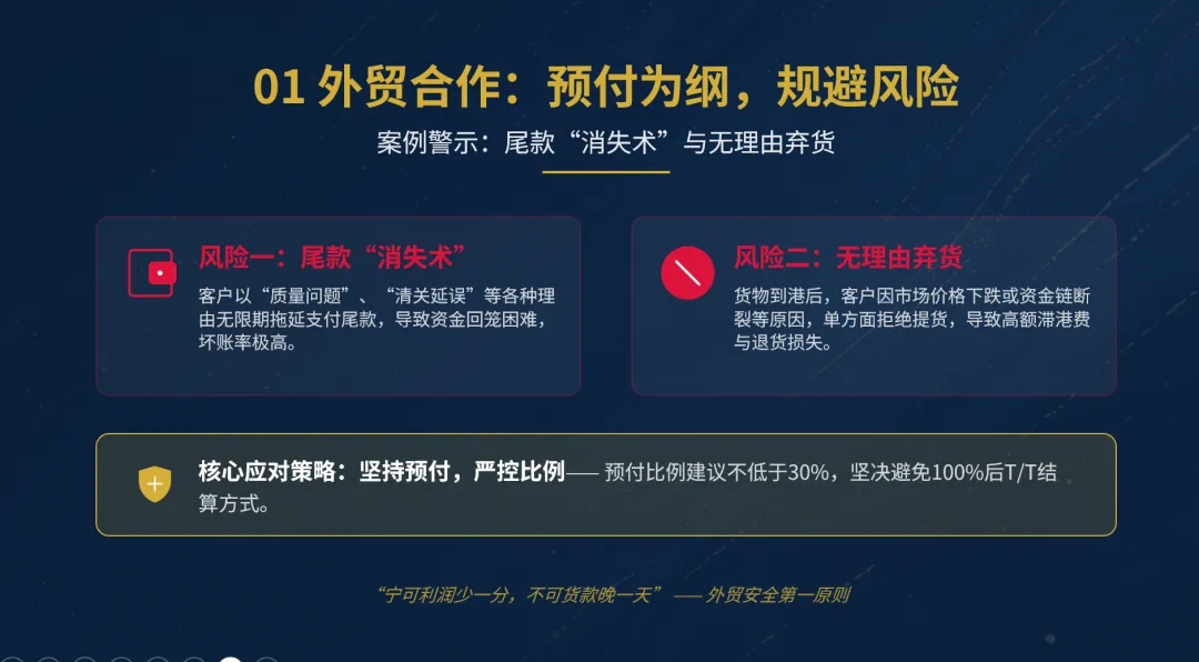 1.外贸合作,必须预付,收到货款后安排生产、发货;