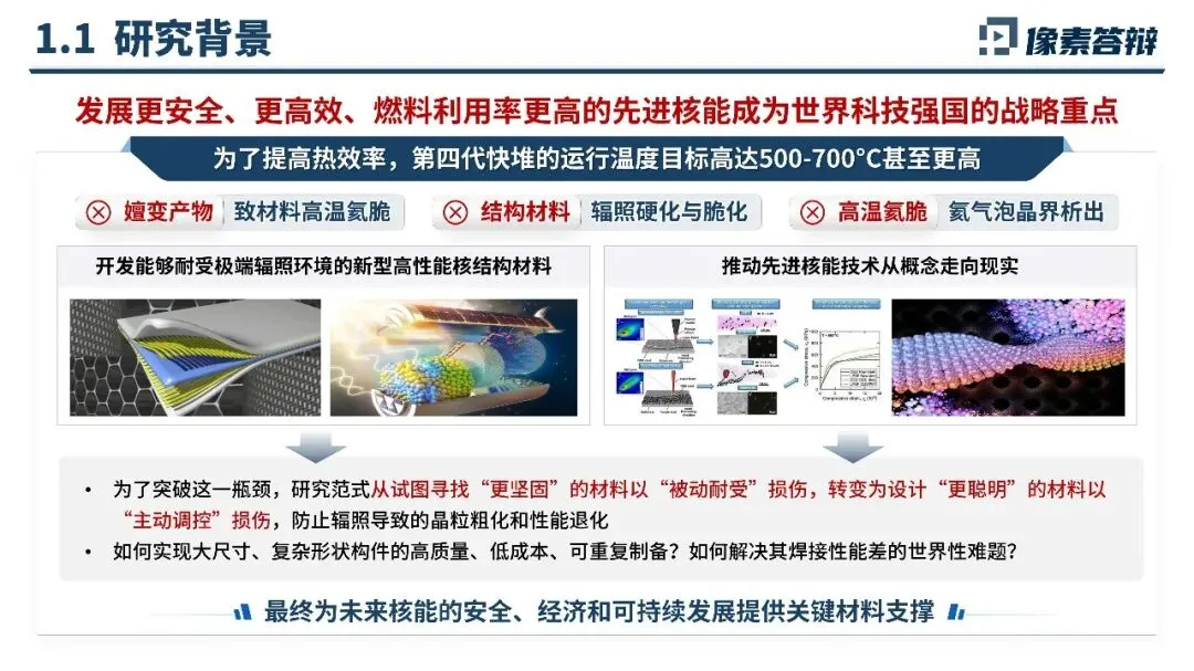 PPT以“第四代快堆高温氦脆”这一工程瓶颈为起点,明确提出研究范式从“被动耐受”向“主动调控”的转变。内容按“背景问题—创新贡献—研究成果—后续计划”层层递进,形成从理论创新到方法建立、再到材料制备与验证的完整闭环,逻辑严密,符合高水平答辩材料的叙事规范。