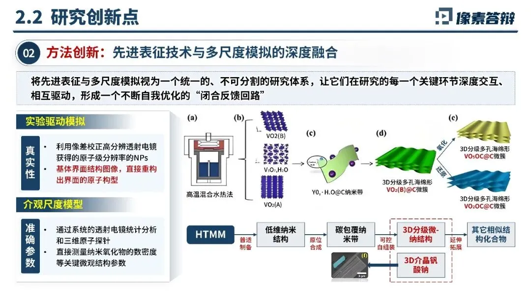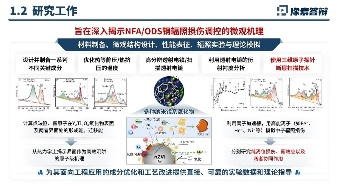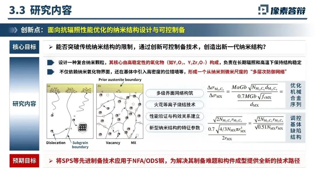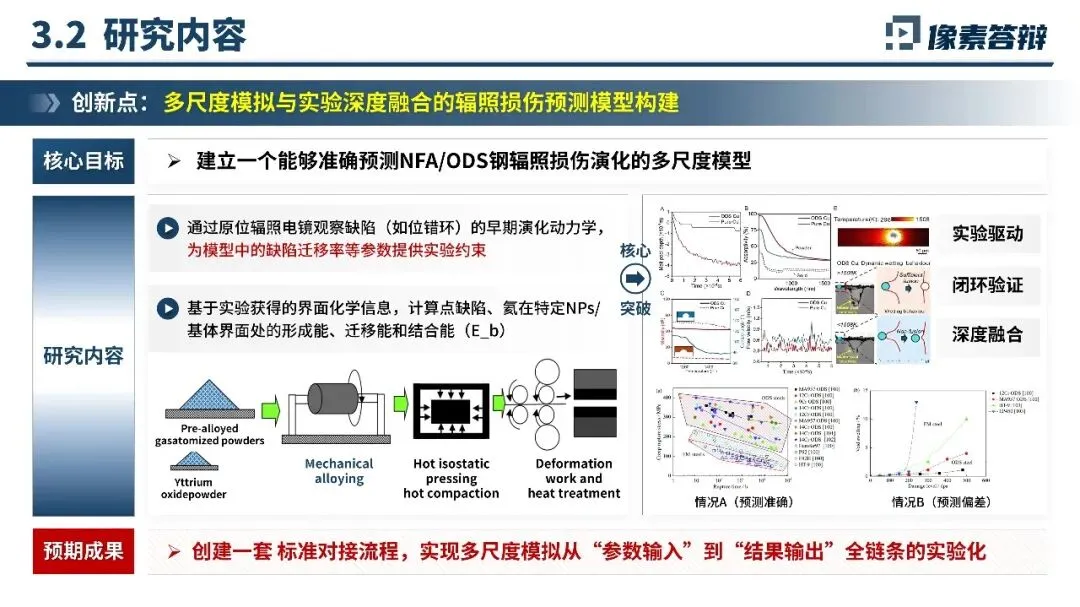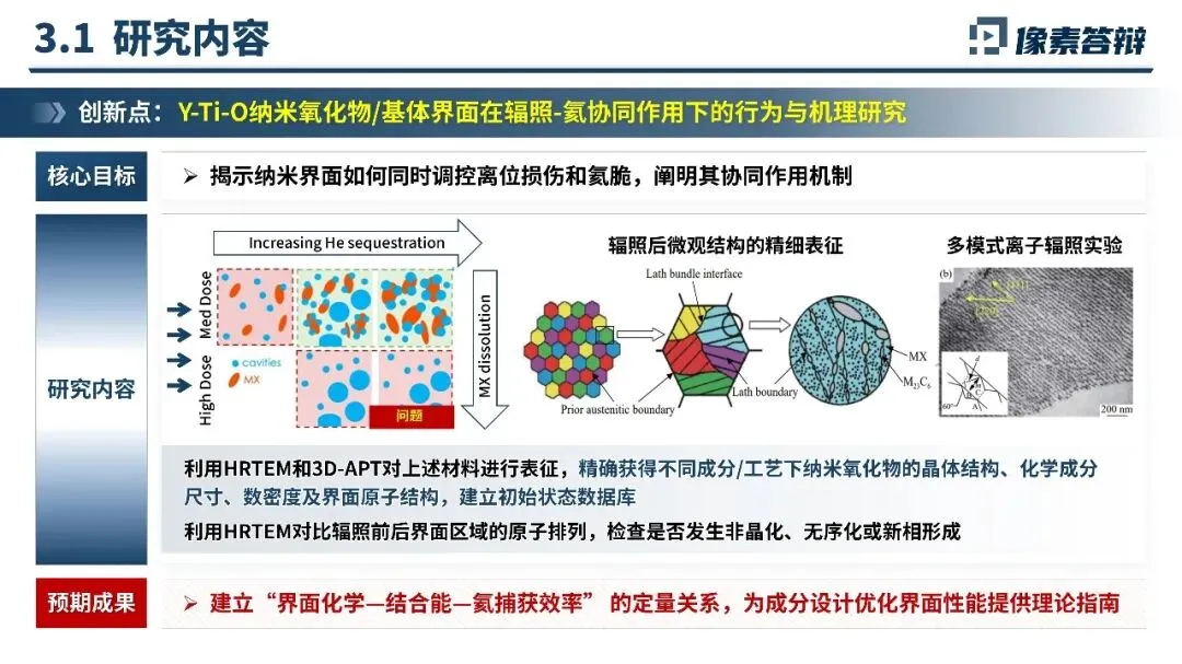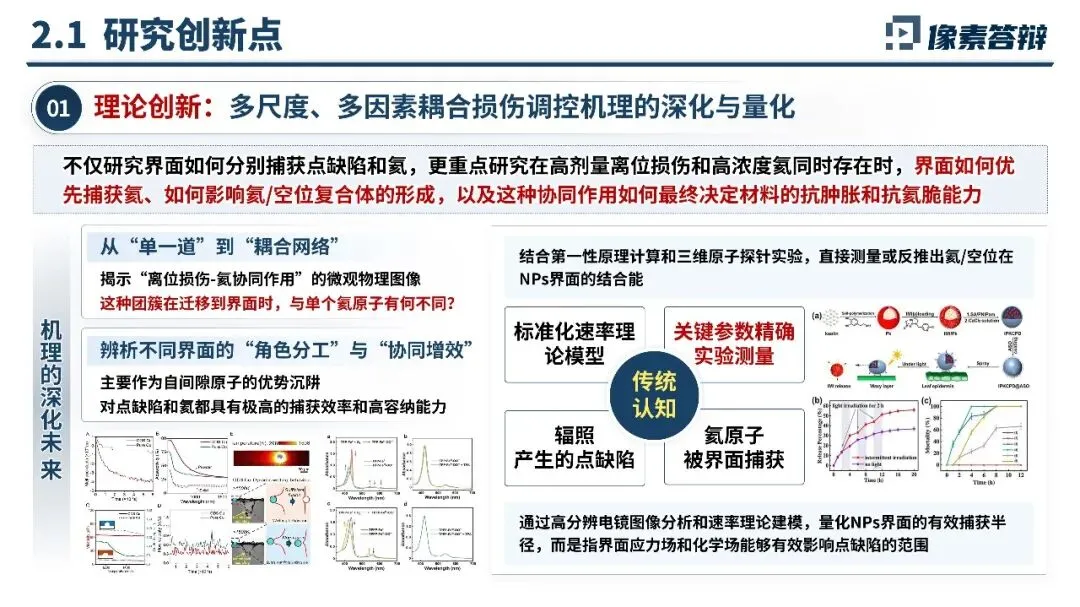 理论创新上,强调“离位损伤-氦协同作用”与界面“角色分工”,超越传统单一界面研究,突出多因素耦合机制。方法创新上,提出“先进表征与多尺度模拟深度融合”,通过“实验驱动—闭环验证”增强模型可信度。创新点与后续成果(如高分辨电镜、三维原子探针实验)对应清晰,支撑有力。