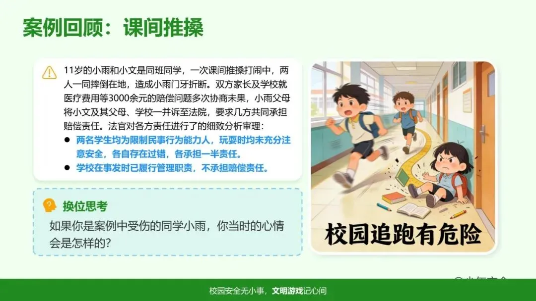 互动引导:同学们,如果你是小雨,你会是什么感受?第一瞬间是疼痛,不是擦伤,而是牙齿断裂带来的刺痛、出血、异样感。然后是害怕,治疗期间还会影响自己的学业,家人的工作时间。课间不是压制玩耍,而是安全地玩。