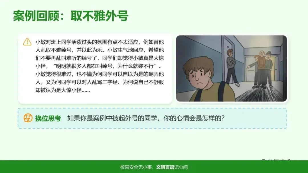 互动引导:如果你是小敏,当别人不断给你起不雅绰号,甚至在你表达不舒服之后仍然继续,你会是什么感受?第一层感受是不舒服,被冒犯。