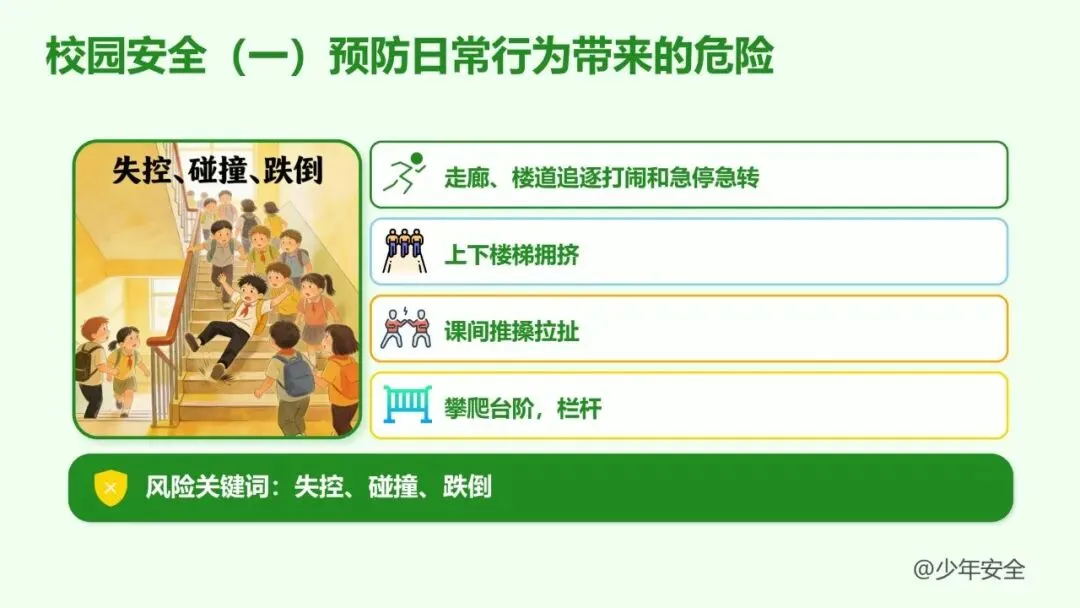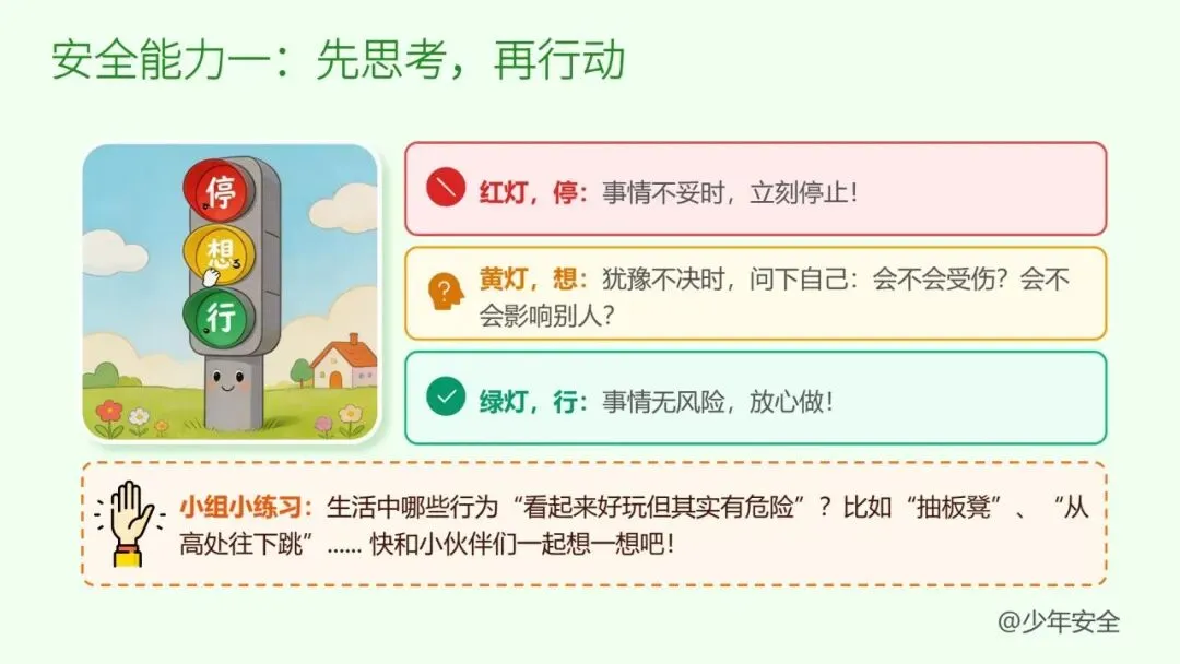 孩子的特点是反应快、行动快、情绪也快。但安全,恰恰需要一个“慢半拍”的能力。在行动之前,先停一秒,想一想。抽板凳、从高处往下跳、走廊追逐、用脚绊别人、拿文具当玩具打闹,这些动作可能会摔倒 ,会撞到头,会吓到别人。