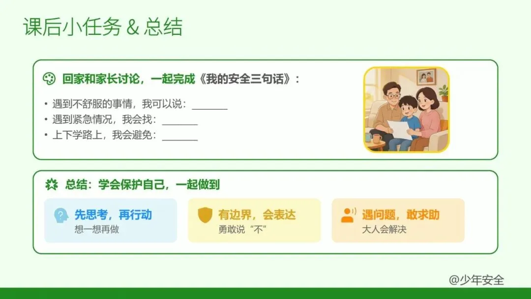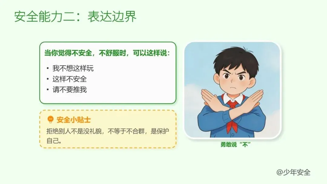 2. 掌握3个关键安全技能:判断危险的能力、拒绝与表达边界的能力、遇到问题及时求助的能力