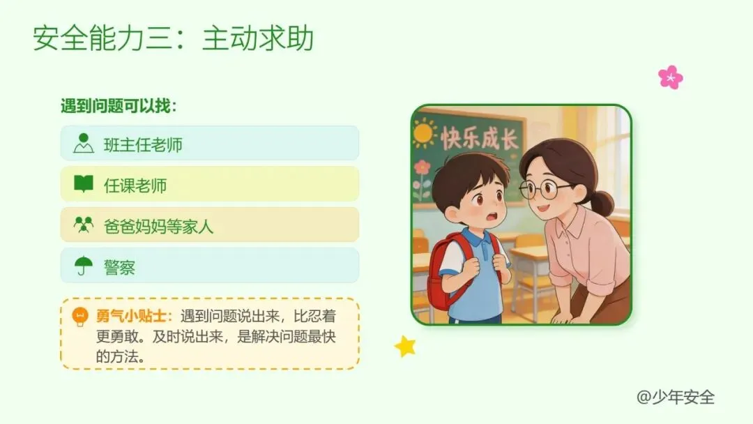 遇到自己解决不了的问题时,一定要学会主动求助。可以找班主任、任课老师、爸爸妈妈,甚至是警察叔叔。遇到问题说出来,比自己忍着更勇敢,也能更快地解决问题。