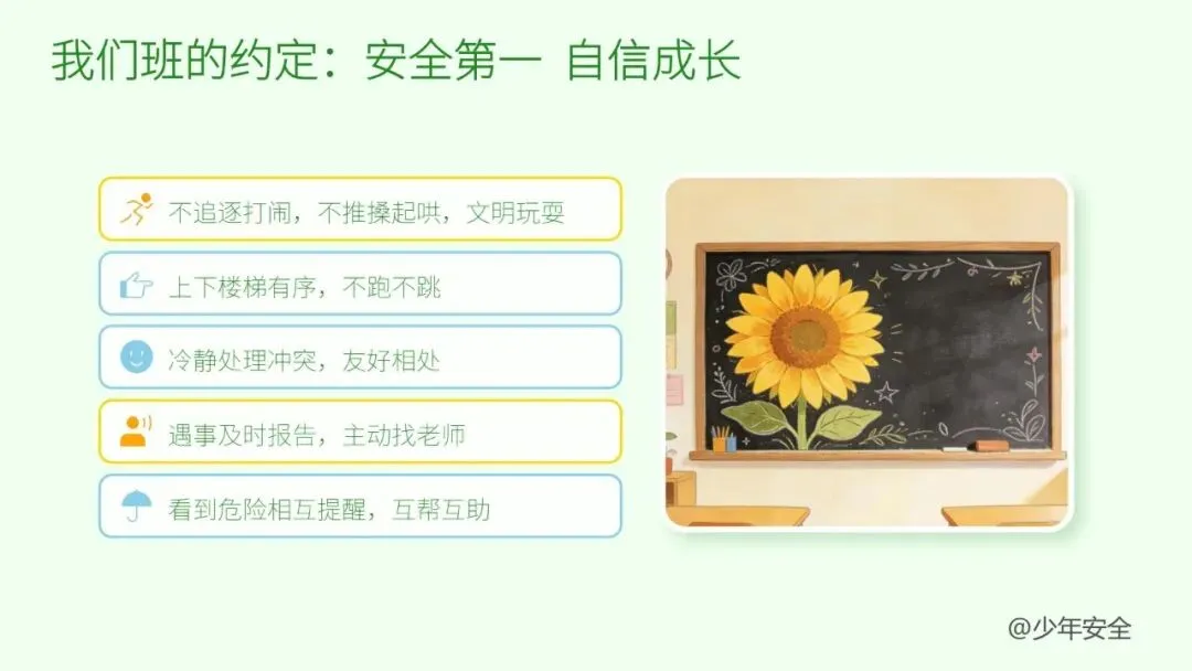 让我们一起制定我们班的安全约定。请大家一起遵守:不追逐打闹,不推搡起哄,上下楼梯要有序,冷静处理冲突,遇到事情及时告诉老师,看到危险要互相提醒。让我们一起努力,营造一个安全、和谐的班级环境。