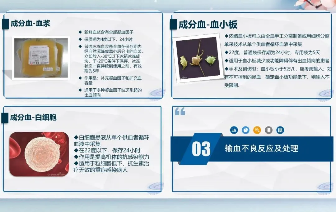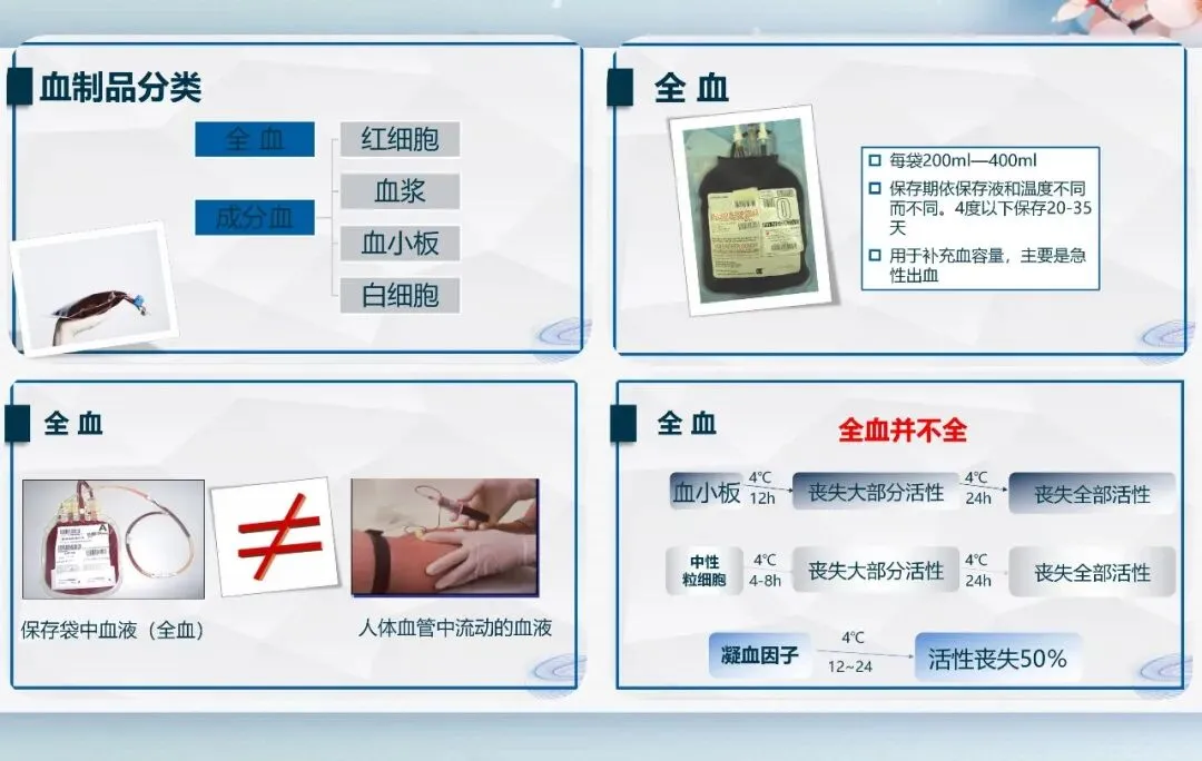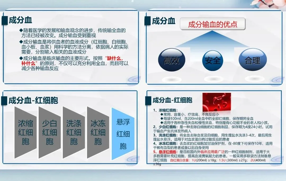 血液制品分为全血与成分血,成分血是临床主流,包括红细胞、血浆、血小板等,具有高效、合理、安全的优势,按缺什么补什么原则使用。
