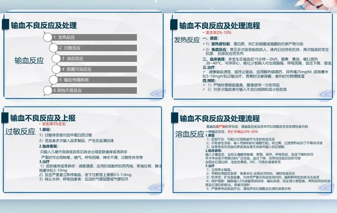 常见不良反应包括发热、过敏、溶血、细菌污染等。发热反应减慢或停止输血,对症降温抗过敏。过敏反应轻者抗组胺处理,严重者立即停药、注射肾上腺素、保持气道通畅。
