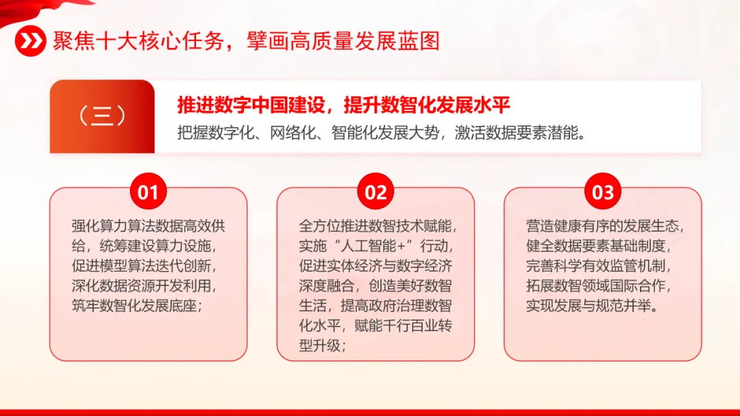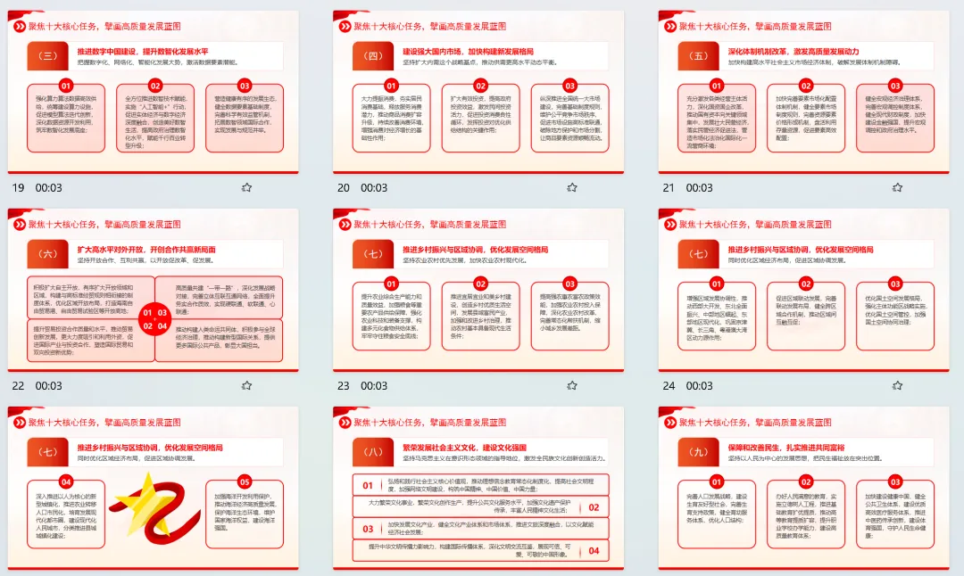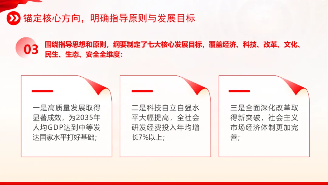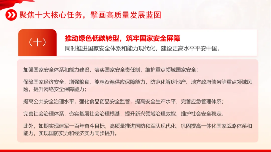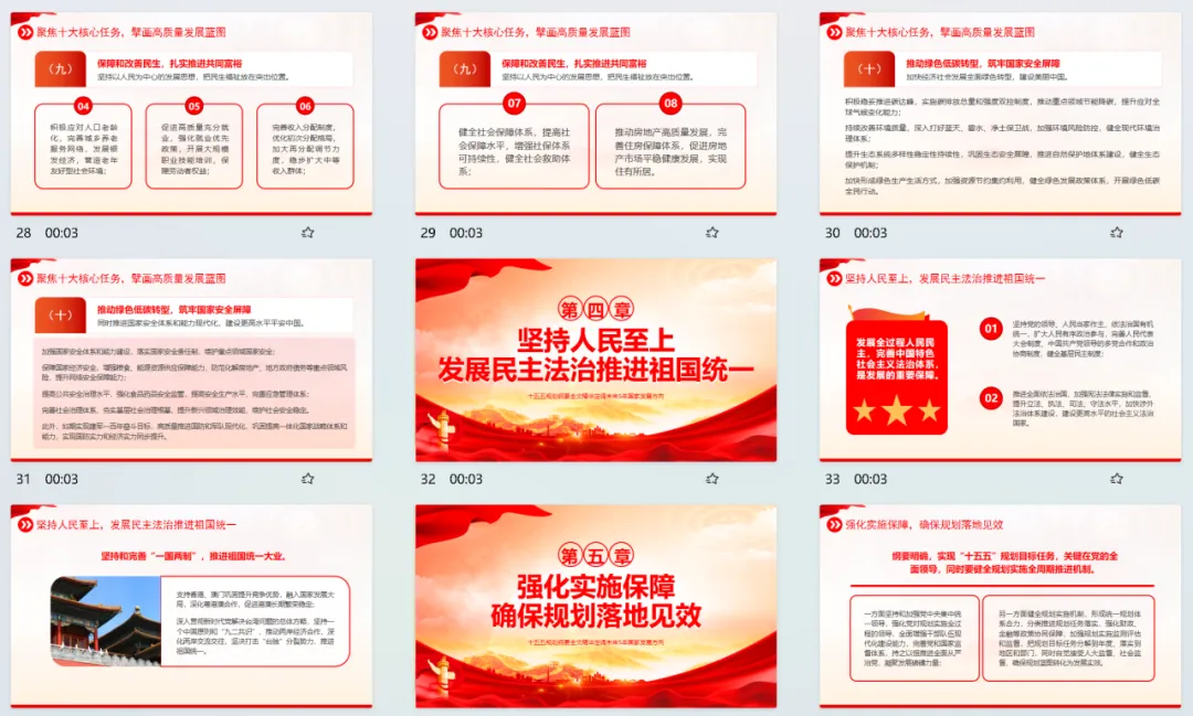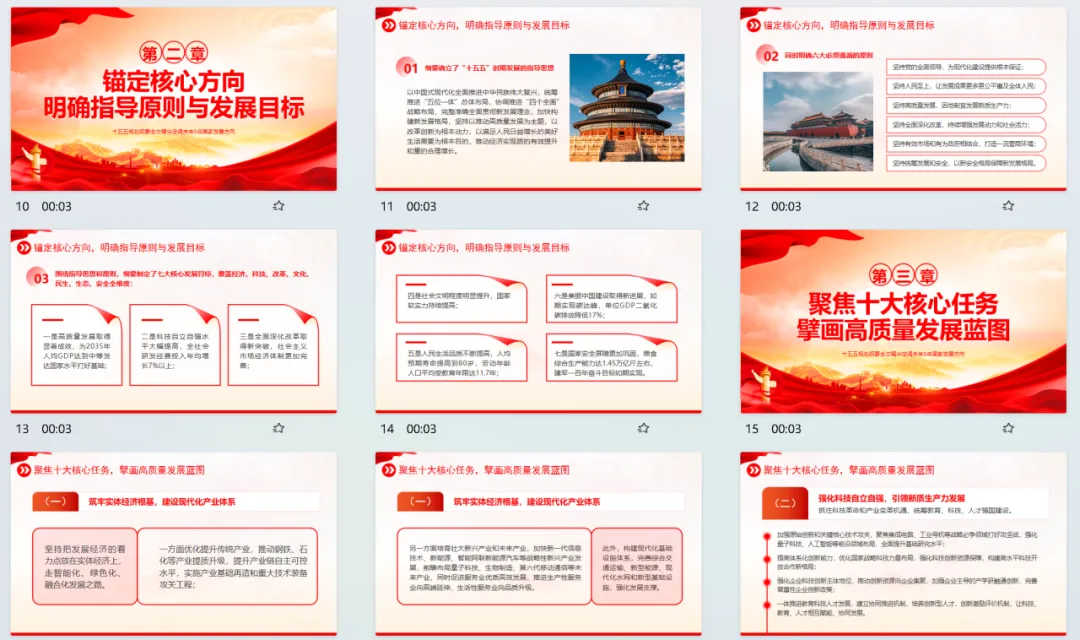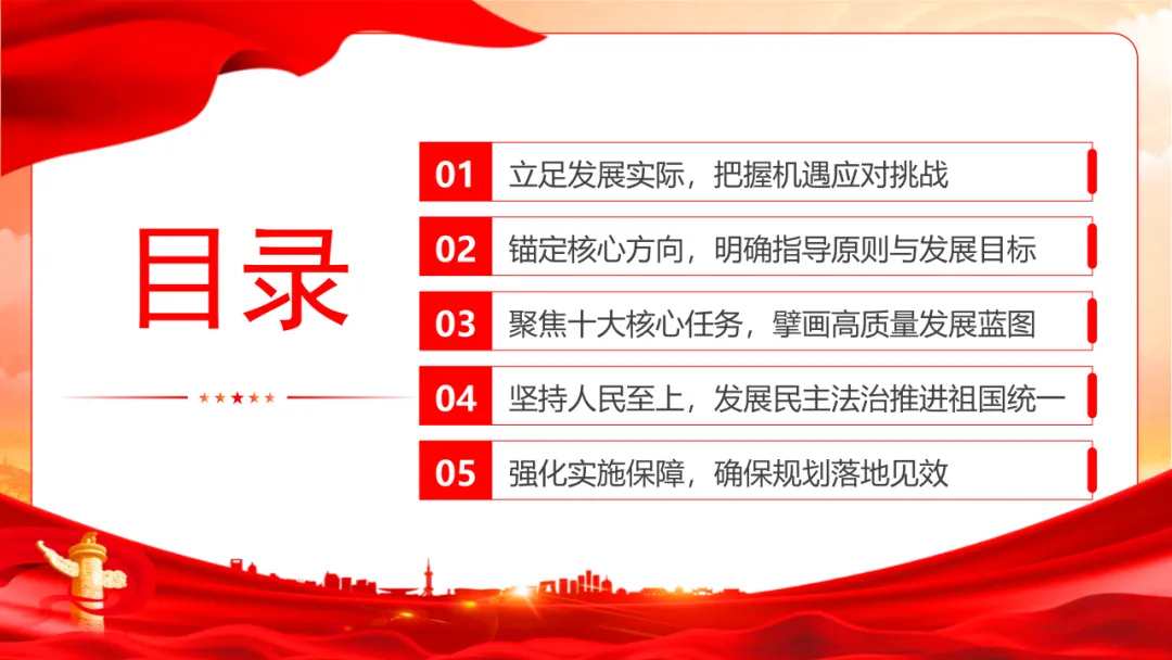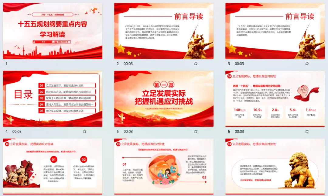 刚刚制作完成的《十五五规划纲要重点内容学习解读》PPT课件,全面聚焦纲要核心要义,系统梳理了“十五五”时期的发展环境、指导思想、主要目标与十大重点任务。页面美观大方,图文结合紧密,结构层次清晰,讲解生动不枯燥,帮助学员快速把握规划精髓。