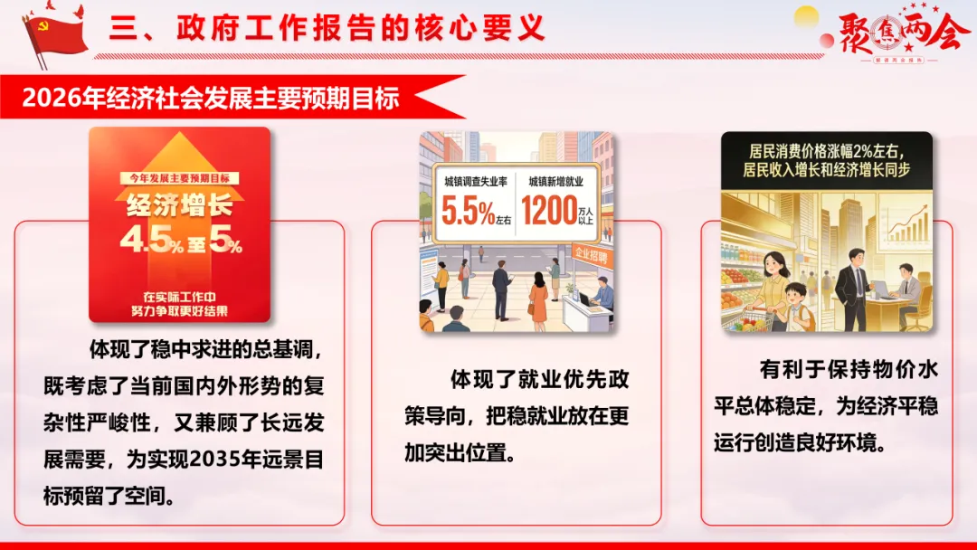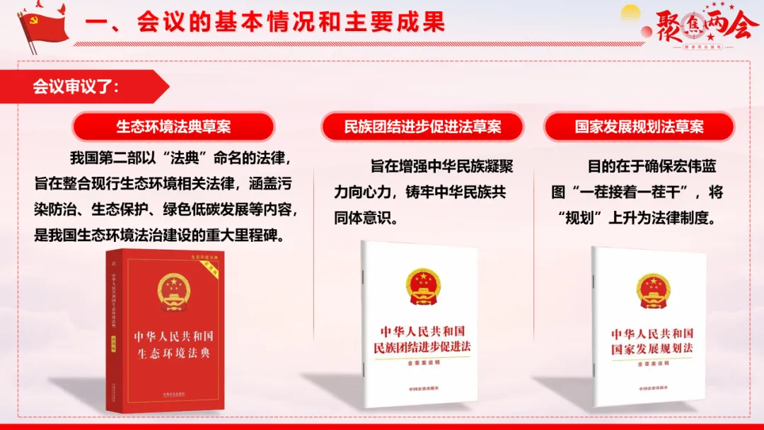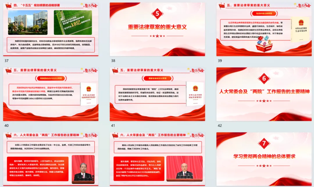 最新党课材料《2026年全国两会精神传达》PPT,系统梳理两会核心成果,内容完整覆盖三场重要讲话、政府工作报告十大任务、“十五五”规划纲要战略部署及重要法律草案核心要点。