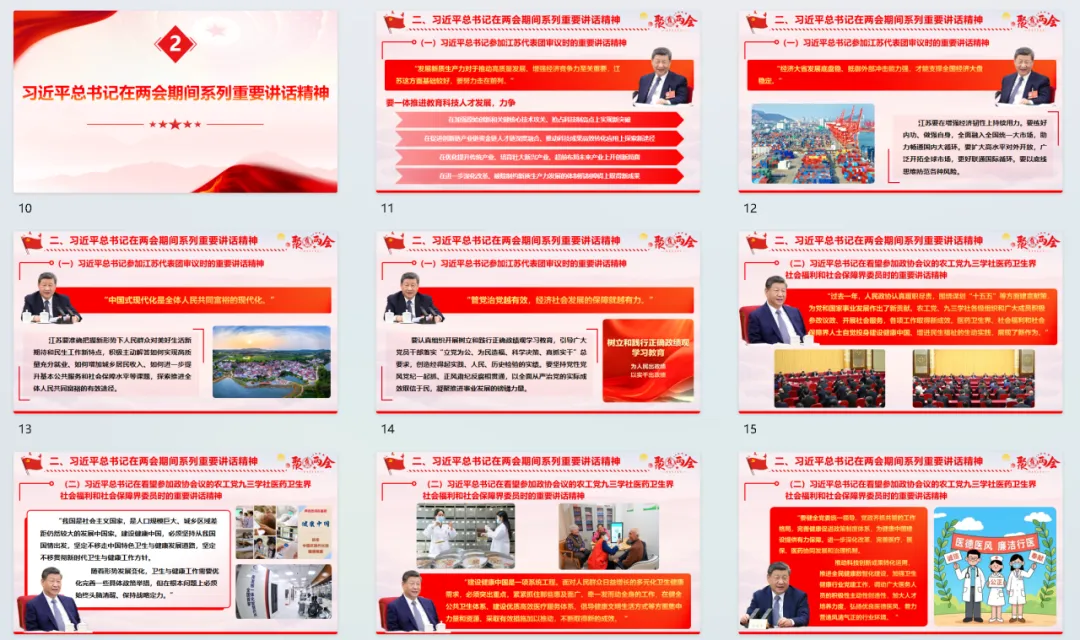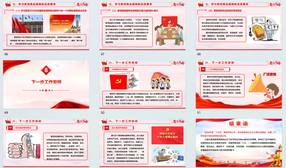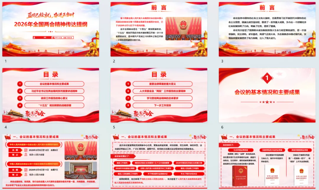 设计上很讲究,页面精致,图文结合自然,逻辑严谨,内容精准,是开展两会精神传达学习的优质范本。PPT共55页,配套演讲稿7200字,完整包含八个部分,详情见下图,适合各单位组织学习。