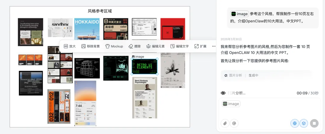 在咱们生成PPT内容的时候,把这些图片作为参考素材丢进去,它会根据这些图去理解整体的视觉风格,然后在每一页里帮你延续这种感觉。