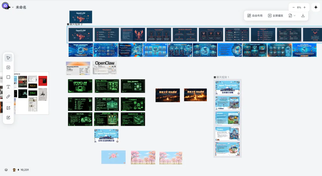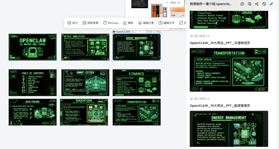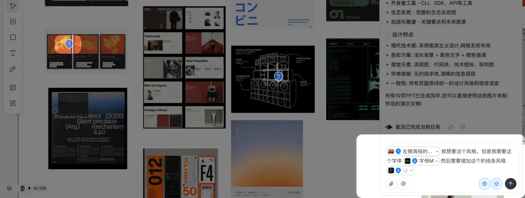 星流里面还有几个骚操作,就是你可以直接使用 Command 键 + 鼠标点击不同的图片,然后可以精准选择不同的图像风格,然后最终生成多个元素集合的 PPT 图。