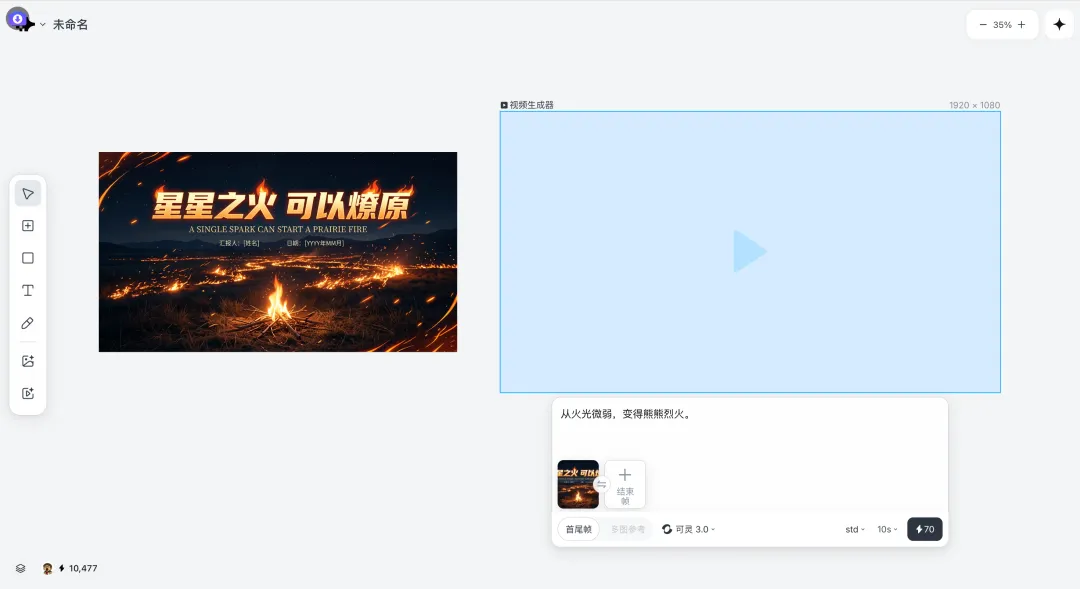 先生成一张符合主题的背景图,比如有星火、有扩散感的那种视觉,然后基于这张图,再去生成一个视频版本,让它动起来,而且提示词也是非常简单的,用简单的一句话“从火光微弱,变得熊熊烈火。”