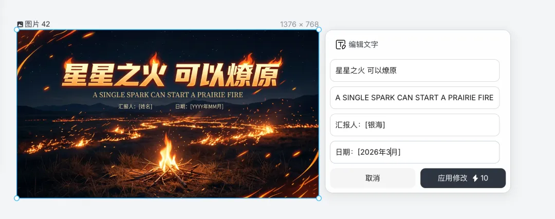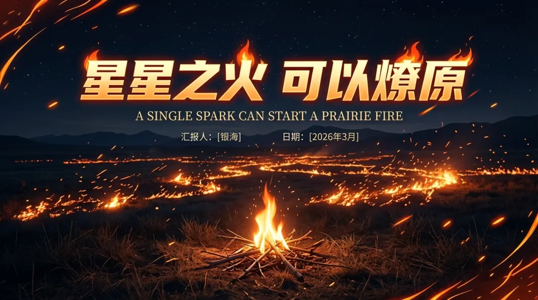 比如我之前做一个偏运营的分享,主题想做得稍微有点燃一点,我脑子里当时的画面就是那种「星星之火可以燎原」的感觉。