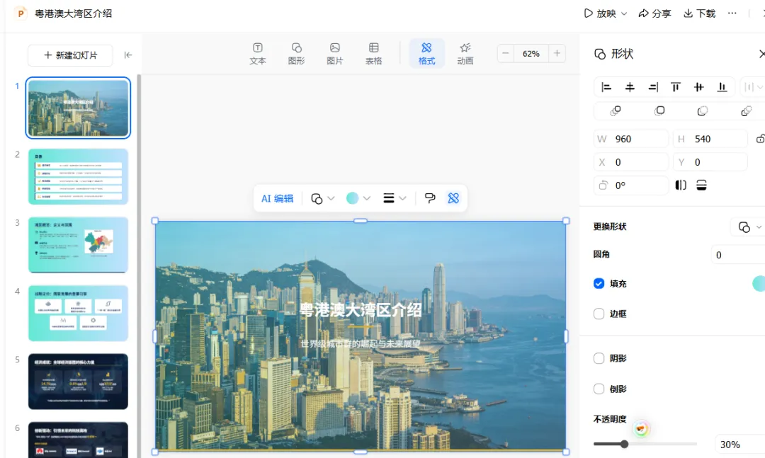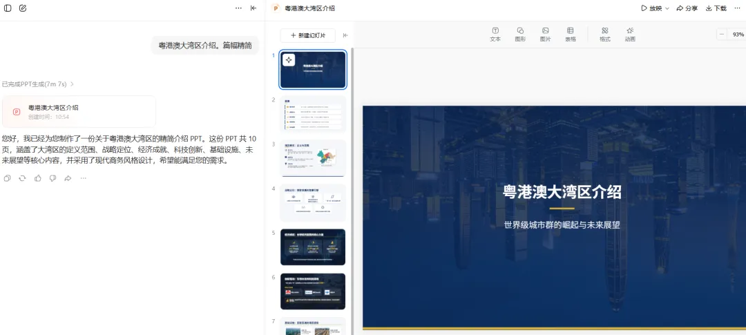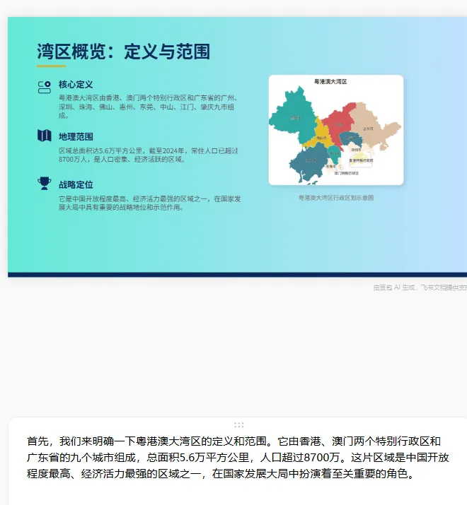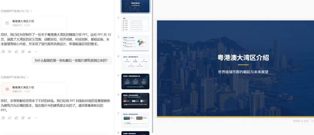 有没有过这样的崩溃时刻?领导临时要PPT,熬到深夜找模板、敲文字、调排版,最后还被说“没质感”;新手做课件、汇报,对着空白PPT无从下手,既不懂设计又不会提炼重点,浪费大量时间还出不了效果😭其实不用这么累,今天就给大家分享一个懒人福音——用豆包生成PPT,不用专业技能,不用熬夜加班,输入指令就能一键生成完整PPT,内置300+模板,还能直接导出编辑,帮你轻松搞定所有PPT场景。1、打开豆包 APP 或官网,直接进入PPT 生成功能入口2、生成方式二选一:按主题生成,或上传 Word/PDF 等文件自动提炼。这里我以主题粤港澳大湾区介绍为例,在篇幅栏选择精简版,快速定位需求粒度。3、约 5 分钟,一份结构完整的初稿 PPT 就生成好了,首页、目录、内容页一气呵成。4、AI 生成的 PPT 相当于毛坯房,关键在人工精修:我发现首页与结束页的建筑图片倒置,直接在豆包内指令替换调整;其余细节(内容润色、字体替换、背景更换、动画演示)都能在线完成,功能与 WPS PPT 高度对齐。其他细节修改,都可以在豆包里进行,包括内容编辑、字体编辑、更换图片、背景演示更换、设计演示动画等,在WPS PPT里能编辑的豆包都可以进行。5、超实用彩蛋:每一页都会自动生成逐字演讲稿,直接填充到备注栏,演讲时提词无忧。7、在线预览试演效果,确认无误后即可免费导出,支持 PPTX 与 PDF 两种格式,下载后还能继续优化。