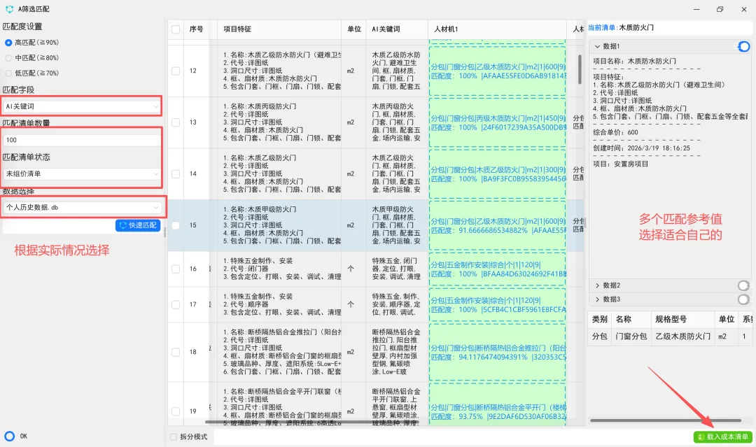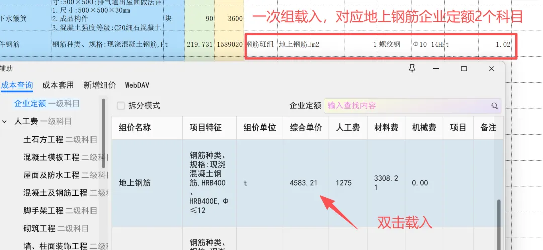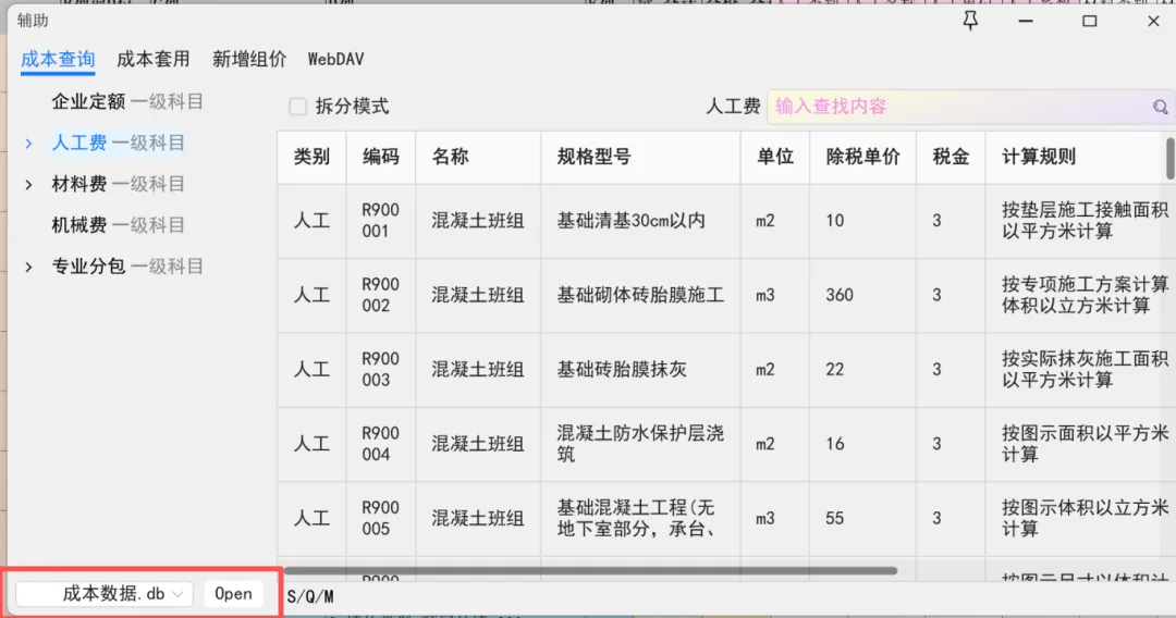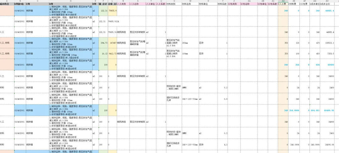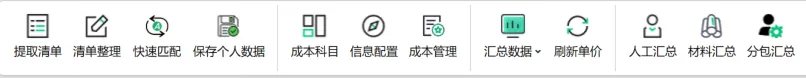 匹配完成本科目,分别人工、材料、专业分包汇总,在对应表格修改调整税金、单价;(可以建立企业造价数据库,快速匹配),达到我们快速调价;