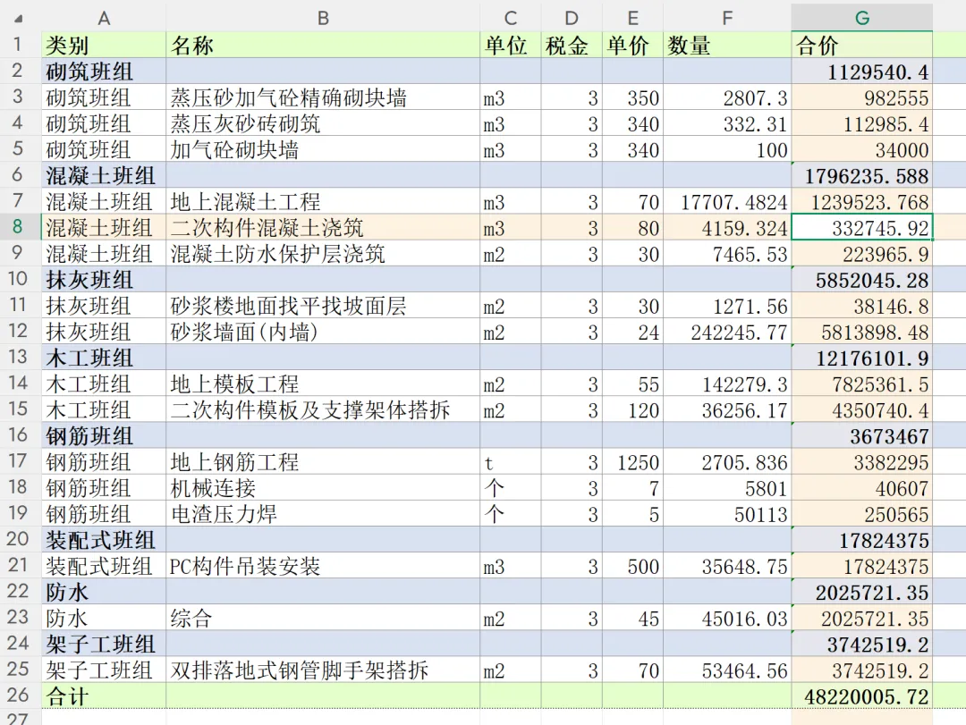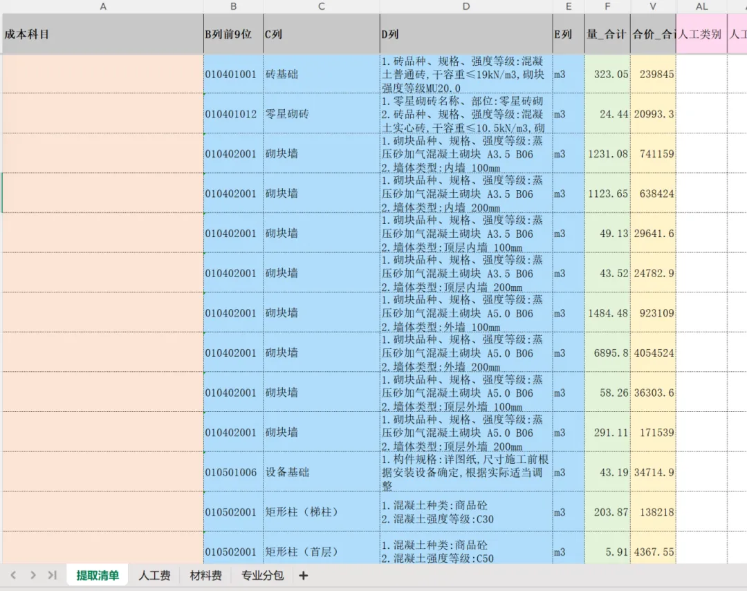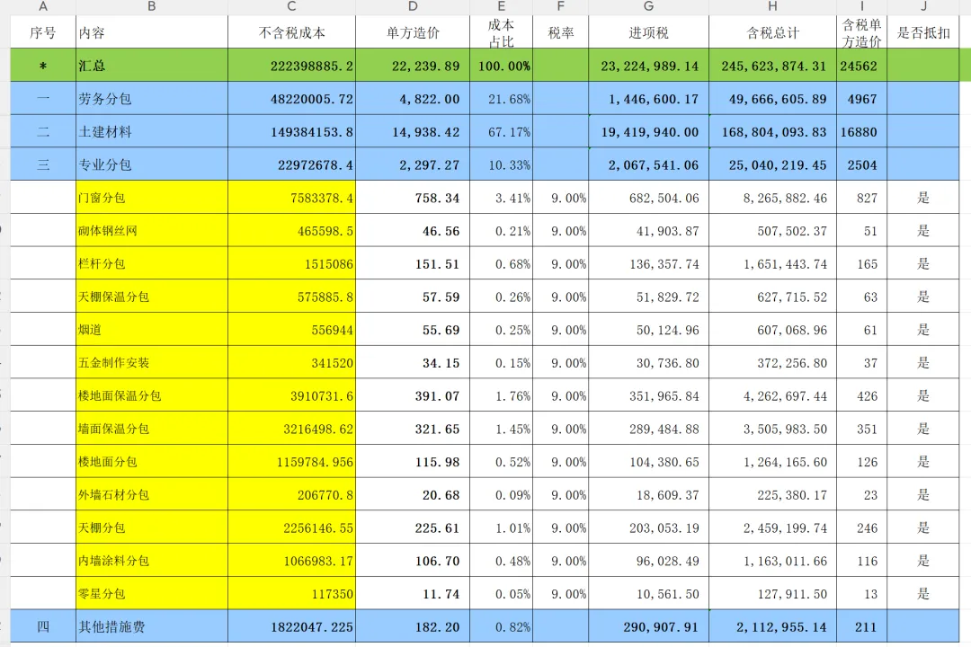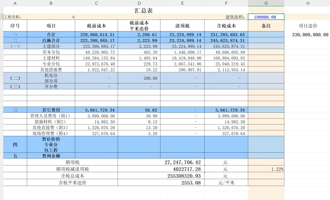 汇总表,把分析汇总表数据和各种其他费用融合,统计分析销项税、含税直接成本、含税单方(不含利润,利润率是根据公司经营策论、自身实力和招标控制价进行研判)。汇总表能让管理者一目了然,项目的实际直接支出,方便调整投标报价。也作为后续全生命周期的最底层基础造价数据。