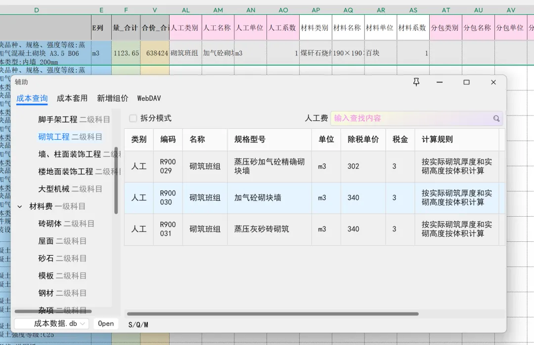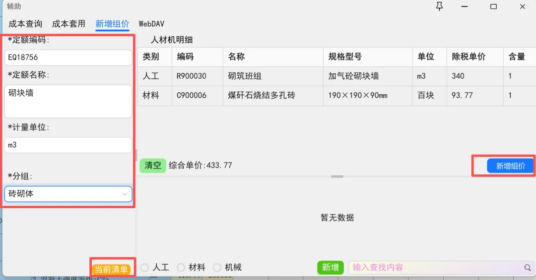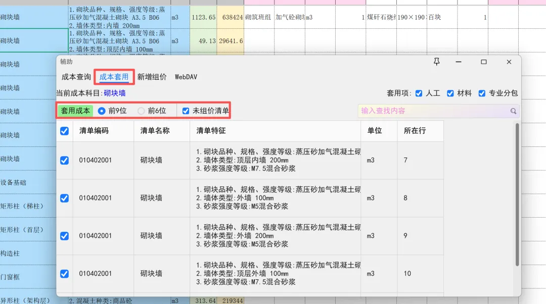 人工、材料、专业分包价格输入完毕,刷新单价,,新的价格会同步到提取清单,
