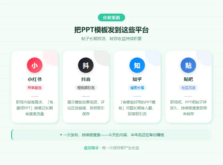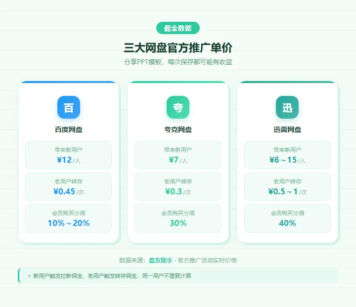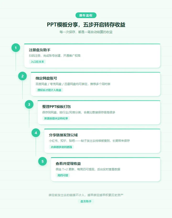 有一类人,每隔一段时间就会在网盘整理一批PPT模板,然后这个帖子就开始自己赚钱一、为什么这个动作有收益逻辑很简单:谁帮它们带来新用户,就给谁钱;谁帮它们带动老用户来保存文件,同样给钱,这件事不需要你去卖东西,不需要粉丝,不需要开店,你只需要做一件早就在做的事——用网盘分享文件当你把PPT模板的网盘链接发出去,有人点进来保存,对方是第一次注册百度网盘的新用户,给你的是拉新佣金,对方是老用户,只是把你的PPT模板存到了自己账号里,给你的是转存佣金,二、 PPT模板这个品类的特殊性分享一个我观察到的规律:资源越实用,保存率越高PPT模板是一个典型的「先存着再说」品类,用户看到一套好看的模板,就算当下不用,也会先保存,这个行为几乎是本能的,这意味着,同样是放一条网盘链接,PPT模板产生的保存动作要比一般内容多得多,而且PPT的需求场景特别广,从汇报、答辩、方案到年终总结,几乎所有职场人都用得上,需求不集中在某一类人身上,而是分散在所有行业、所有岗位这就带来了一个有意思的收益结构:你发一个PPT模板包,触达的不是一个垂直圈子,而是一个横向的、非常宽泛的需求池,百度网盘转存 ¥0.45/次,夸克网盘转存 ¥0.3/次,迅雷网盘转存 ¥0.5~1/次,单笔看起来不多,但这件事的边际成本是零你做一次内容,资产就在那里了,今天发的帖子,三个月后还有人搜到、点进来、保存——那一次保存,还是会给你结算一笔佣金,你不需要为那一笔钱额外付出任何劳动刚开始铺内容的时候可能一天只有几十,但随着帖子越来越多,历史内容也在持续帮你赚钱,有人铺到一定数量之后,某天突然发现后台收了大几百,而那一天他什么都没做,第二步,在盘友助手里绑定你的网盘账号,完成推广授权第三步,打开网盘APP,把你的PPT模板整理好,生成分享链接第四步,把链接发到小红书、知乎、贴吧——你平时怎么分享还是怎么分享注意:绑定前发出去的链接不计入,绑定之后才开始积累所以这件事越早做越好,因为每拖一天,就少积累一天的历史资产,如果你现在只在私域(群里、朋友圈)分享,可以考虑同步到公域,职场类内容在小红书的搜索量一直很稳,「PPT模板免费领」这类帖子常年有人搜,知乎上的「有什么好看的PPT模板」问题,每年都有新的人来翻,公域的好处是内容会被持续搜索到,触达是长期的,不依赖你的粉丝基础就算你现在没有任何粉丝,只要内容质量过得去,一样有人搜到、保存、带来收益,这才是这件事真正有意思的地方——它是一个不依赖流量积累的收益模型如果你有整理PPT模板的习惯,可以先把盘友助手绑定上,让这个动作带来额外收益,