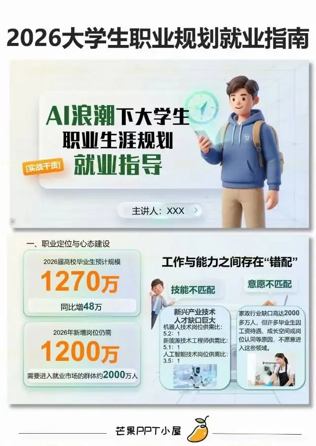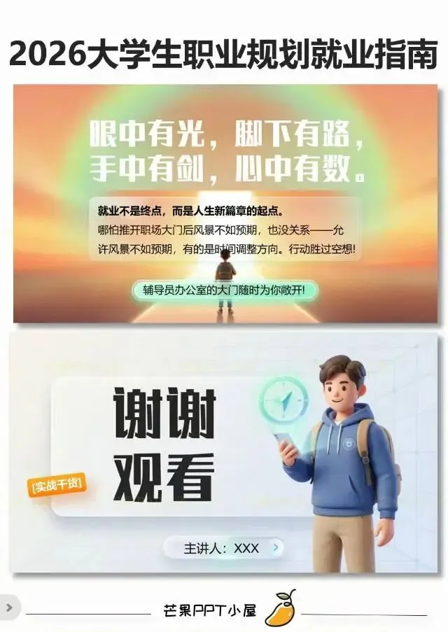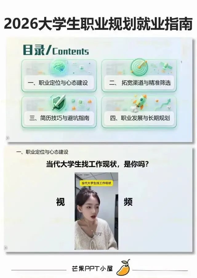 • 页数:ppt共29页,有5800字参考发言稿• 内容素材:内有2个关于大学生找工作的短视频~• 适用场景:可用大学生就业,大学生职业生涯规划,大学生找工作,主题班会等等主题演讲!!