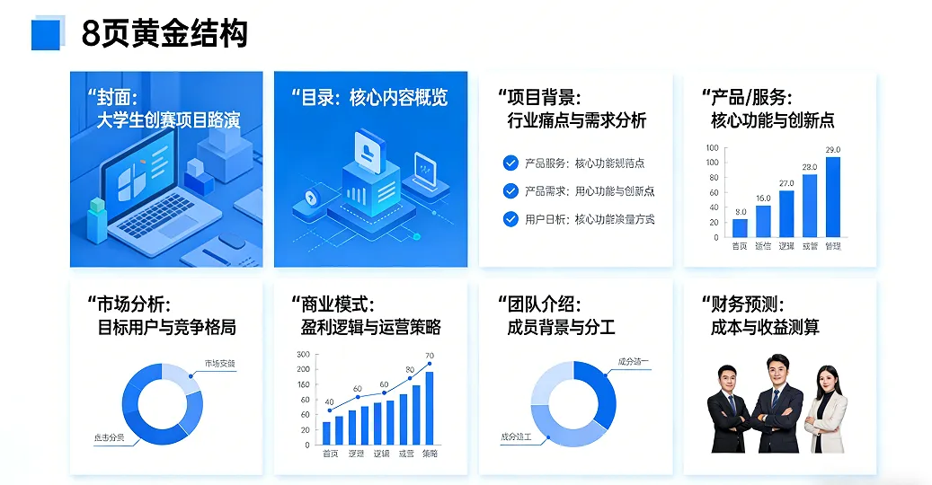 核心原则:每页只讲1个核心观点,文字精简(每页不超过30字)、重点突出,适配路演3-5分钟节奏,兼顾专业性与通俗性,让评委快速get项目核心价值。