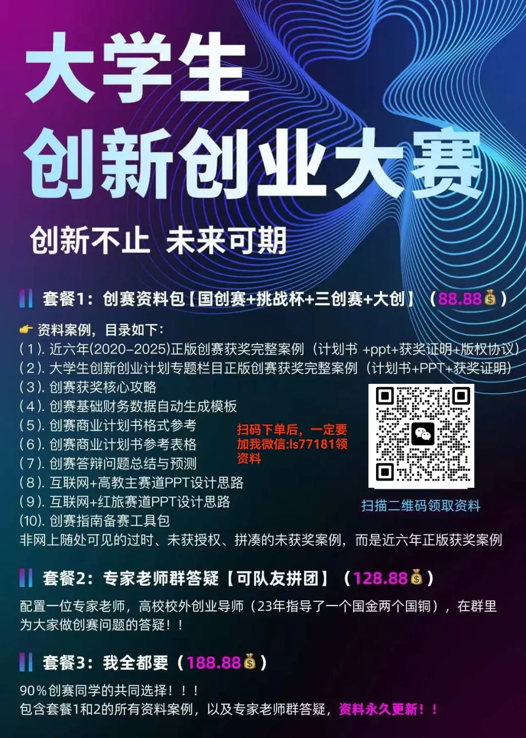 点这段文字查看400+近5年(2020-205)中国国际大学生创新大赛(原互联网+)、挑战杯、三创赛、大创省国奖案例!每份案例包括完整的计划书➕PPT➕获奖证明➕转让协议(永久更新)