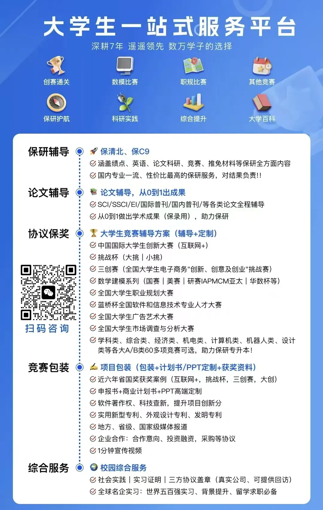 点击文字查看👉:想获奖?看下创赛指南可以给你提供哪些服务吧!真正的一站式创赛服务!