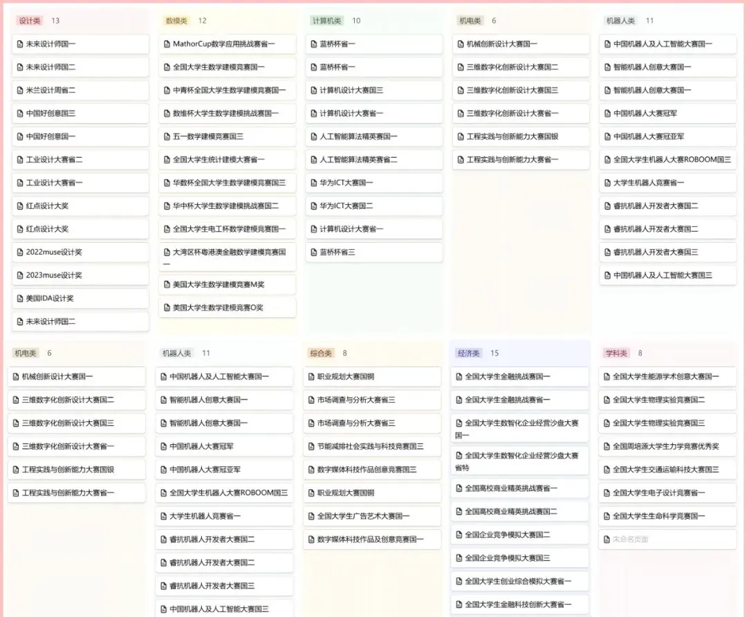 包含赛事:机器人创意、机器人及人工智能、睿抗机器人、机械工程创新、计算机设计、节能减排、服务外包、能源经济、三维、商挑、生科赛、正大杯、数媒、算法精英、统计建模、光电设计、计算机应用、东方设计、交科赛、冶金科技...