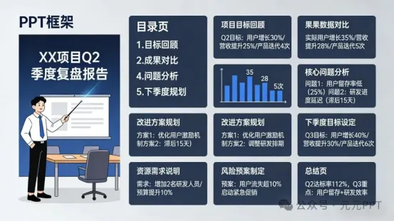 比如向老板做季度项目复盘,指令可以这样写:“请帮我生成一份关于 XX 项目 Q2 季度复盘的 PPT 框架,受众是公司老板,汇报场景是季度工作会议,核心内容包含项目成果与目标对比、核心问题与改进方案、下季度规划,要求逻辑清晰、数据化呈现,共 10 页”。精准的指令能让 AI 生成的框架直接适配汇报场景,完美契合老板的阅读习惯。
