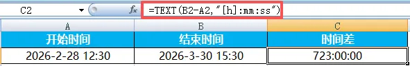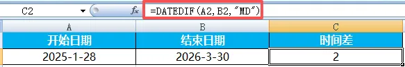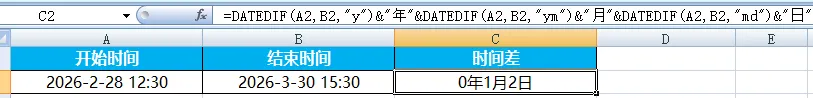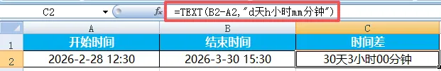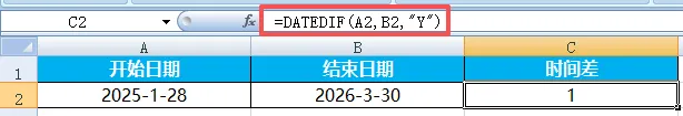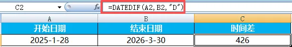 Excel中日期计算是为了管时间、算间隔、做提醒、排计划。日常工作中所有与“时间”相关的内容,都需要用到相关函数。比如计算员工工龄、统计出勤天数、承兑到期提醒、生产排期计划等等,都会涉及到日期与时间函数的使用。在日期和时间函数中有一个隐藏函数:DATEDIF,专门用来计算两个日期之间的差值。其语法为=DATEDIF(开始日期,结束日期,"单位代码")常用单位代码为“Y"、“M"、“D"分别代表相差的整年数、整月数以及天数。这样讲感觉不太能get几个单位之间的区别,我们以一组日期来举例说明。开始日期为2025年1月28日,结束日期为2026年3月30日。两个日期的整年数差值为“1”。算两个日期之间的天数差,也可直接将两个日期相减。差值=结束日期-开始日期。两个时间直接相减,即可得到时间差。(时间差可能显示为小数,需要设置为时间格式或用TEXT函数转换)之前说过,“HOUR”为提取函数,=HOUR(B2-A2)表示从时间差中提取小时。提取分钟、秒数,可更换对应函数操作。当结束时间早于开始时间,计算结果为负,会直接显示乱码。如果因为两个时间写反了,可以直接用ABS函数取绝对值。日期、时间混合减:=TEXT(结束时间-开始时间,"d天h小时mm分钟")TEXT函数可以按自己想要的格式,把数值、日期、时间转换为文本。其语法为=TEXT(要格式化的值,"格式代码"),格式代码可参考单元格设置中的时间、日期格式。示例中B2与A2直接相减,其结果会默认显示为30.125。在Excel中,1 天 = 1,1 小时 = 1/24,1 分钟 = 1/1440。注意:若选择的格式不包含天、且时间间隔超过24小时,必须用带“[]”的格式代码,(如[h]),否则24的倍数会自动归0。计算时间间隔(X年X月X日):=DATEDIF(A2,B2,"y")&"年"&DATEDIF(A2,B2,"ym")&"月"&DATEDIF(A2,B2,"md")&"日"工龄计算:=DATEDIF(入职日期,TODAY(),"Y"),TODAY为动态更新函数,无需手动更改当前日期。期待下周与你相见~我们每周,一见。每周一,见。