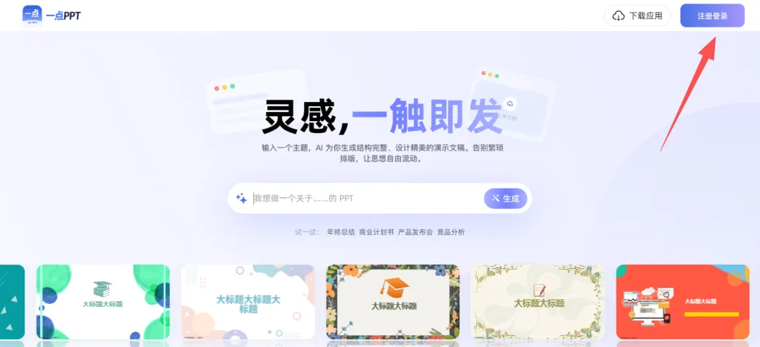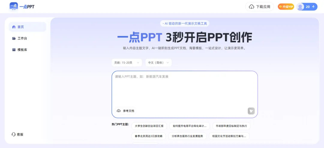 今天要介绍的工具叫“一点PPT”。它是一款AI驱动的在线PPT生成神器,主打“一句话生成”和“文档一键转PPT”。无论你是要做年终汇报、教学课件还是毕业答辩,只需输入主题或导入Word文档,它就能在10秒内生成结构完整、排版精美的成品,完美解放双手。