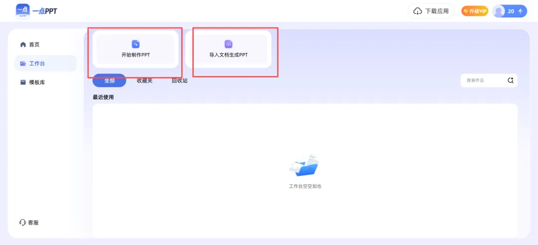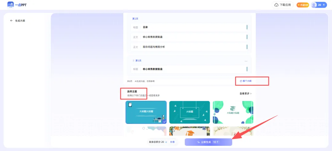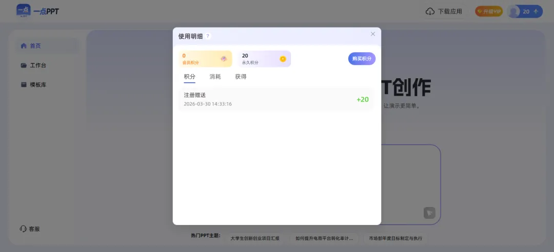 现用户注册即赠20永久积分,可用于免费PPT生成