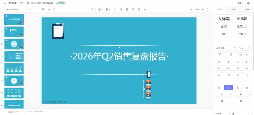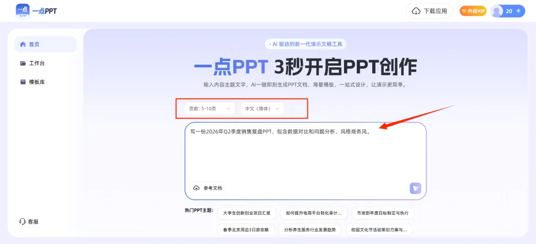示例: “写一份2026年Q2季度销售复盘PPT,包含数据对比和问题分析,风格商务风。”