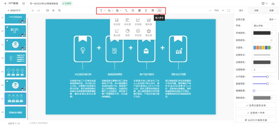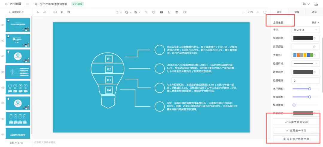 2.更换模板:不喜欢这个配色?右侧栏点击“主题”,海量模板任你换,一键换色。