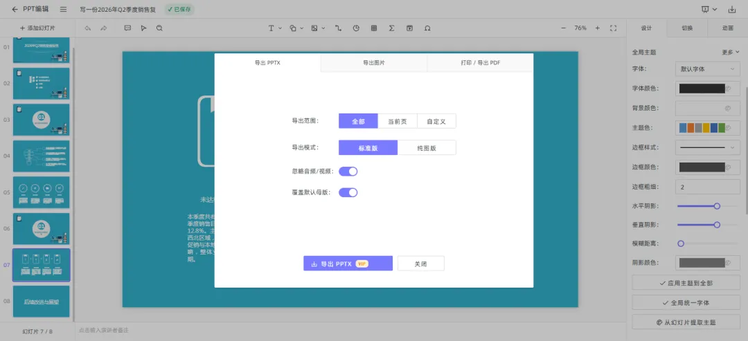 编辑满意后,点击右上角的“导出”。你可以选择导出为PPTX格式(微软Office专用),也可以导出为PDF或图片格式,方便分享和打印。